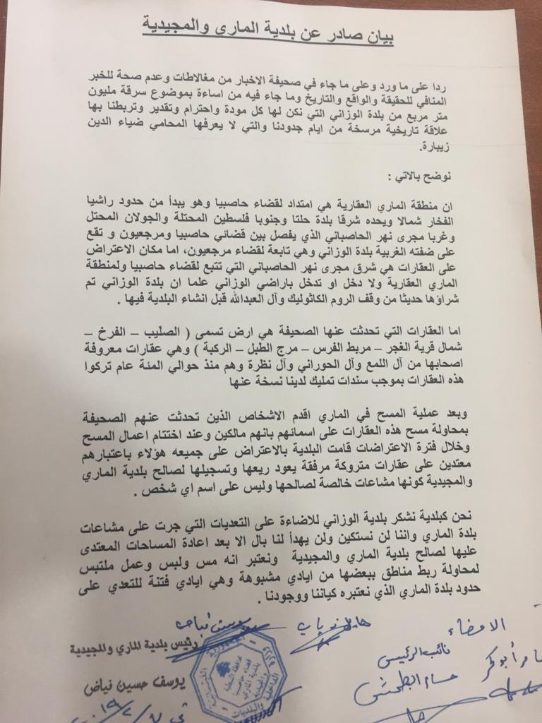 نوضح التالي: ان منطقة الماري العقارية هي امتداد لقضاء حاصبيا وهو يبدأ من حدود راشيا الفخار شمالا، ويحده شرقا بلدة حلتا وجنوبا فلسطين المحتلة والجولان المحتل، وغربا مجرى نهر الحاصباني الذي يفصل بين قضائي حاصبيا ومرجعيون، وتقع على ضفته الغربية بلدة الوزاني وهي تابعة لقضاء مرجعيون، أما مكان الإعتراض على العقارات هي شرق مجرى نهر الحاصباني التي تتبع لقضاء حاصبيا ولمنطقة الماري العقارية ولا دخل أو تدخل باراضي الوزاني، علما ان بلدة الوزاني تم شراؤها حديثا من وقف الروم الكاثوليك وآل عبدالله قبل انشاء البلدية فيها.