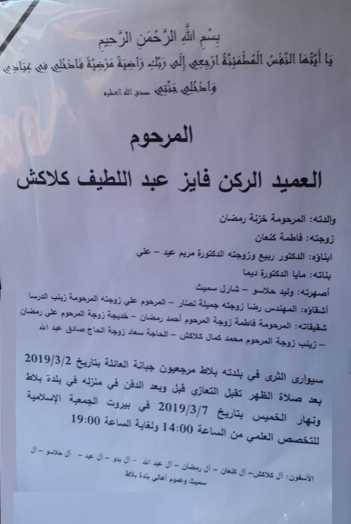 إنتقل الى رحمته تعالى العميد الركن المتقاعد فايز عبد اللطيف كلاكش