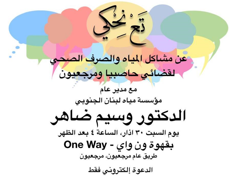 تحت عنوان «تعا نحكي عن مشاكل المياه والصرف الصحي لقضائي حاصبيا ومرجعيون»، يُنظم لقاء حواري مع مدير عام مؤسسة مياه لبنان الجنوبي الدكتور وسيم ضاهر الساعة الرابعة عصر يوم السبت 30 آذار 2019 في استراحة ون واي - One Way طريق عام جديدة مرجعيون.