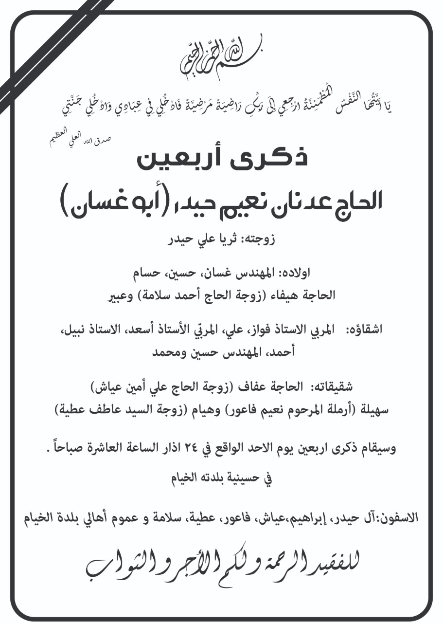 تصادف نهار الأحد الواقع فيه 24 آذار 2019 ذكرى مرور أربعين يوماً على وفاة المرحوم عدنان نعيم حيدر (أبو غسان)