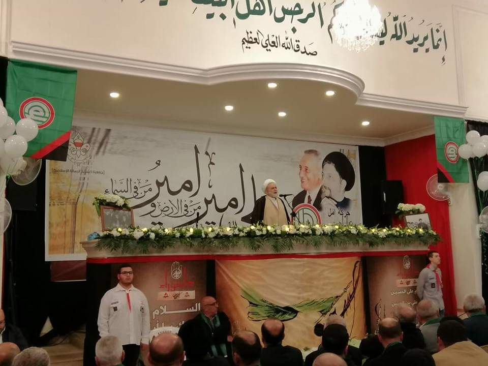 اﻻحتفال استهل بأي من الذكر الحكيم ثم كلمة لسماحة مفتي مرجعيون وحاصبيا العﻻمة الشيخ عبد الحسين عبدالله الذي تحدث عن مزايا وقيم العدل والمساواة في فكر اﻻمام علي “ع”