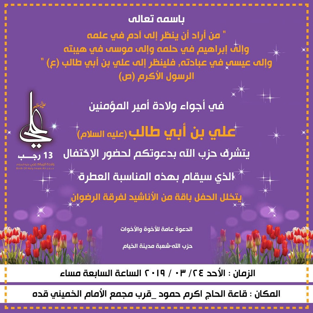 في أجواء ولادة الامام علي (ع) دعت شعبة الخيام في حزب الله لحضور إحتفال تقيمه بهذه المناسبة العطرة والذي سيتخلله باقة من الأناشيد لفرقة الرضوان الإنشادية.