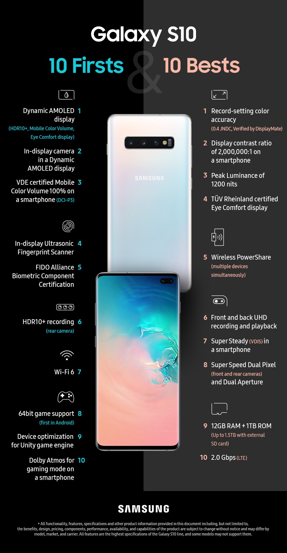وتتميز تشكيلة هواتف S10 بشاشة العرض الديناميكية من نوع AMOLED والحائزة على أول شهادة على مستوى القطاع لتوفيرها حجم ألوان 100٪ في الهواتف المتحركة في نطاق الألوان DCI-P3، مما يعني أن الشاشة قادة على توفير عرض مميز للألوان ونسبة تباين وإضاءة مثالية. كما حصلت شاشة الهاتف على شهادة Eye Comfort من مؤسسة TÜV Rheinland. وتُعد ميزة ماسح بصمات الأصابع بالموجات فوق الصوتية أول طريقة متقدمة لمسح بصمات الأصابع على الشاشة تحصل على شهادة اعتماد من منظمات معايير الإنترنت لمزايا التحقق البيومترية FIDO Alliance Biometric Component على مستوى الهواتف الذكية. بالإضافة إلى ذلك، توفر تقنية مشاركة الطاقة لا سلكياً في مستوى عالٍ من الراحة والمرونة من خلال قدرتها على شحن أجهزة متعددة في وقت واحد.