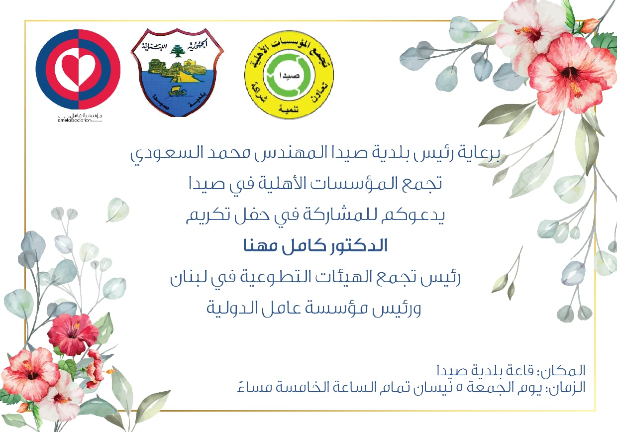 الجمعة 5 نيسان: تكريم الدكتور كامل مهنا في صيدا م أ ر 31\3\2019 موقع خيامكم Google+TwitterFacebookWhatsApp برعايةرئيس بلدية صيدا، المهندس محمد السعودي، دعا تجمع المؤسسات الأهلية في صيدا للمشاركة في تكريم الدكتور كامل مهنا، رئيس مؤسسة عامل الدولية. الزمان: الخامسة عصر يوم الجمعة 5 نيسان 2019 المكان: قاعة بلدية صيدا