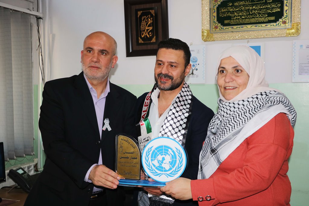 وقدمت مدرستا طبريا والقسطل درعاً تكريمياً للفنان عمار حسن تقديراً لمشاركته أبناء المخيم في اليوم المفتوح.