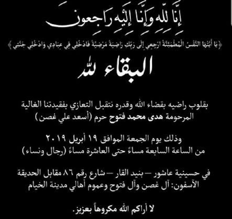 تتقبل العائلة التعازي بفقيدتها الغالية يوم غد الجمعة ١٩ أبريل (نيسان) 2019 من السابعة مساء حتى العاشرة ليلاً (رجال ونساء) في دولة الكويت.