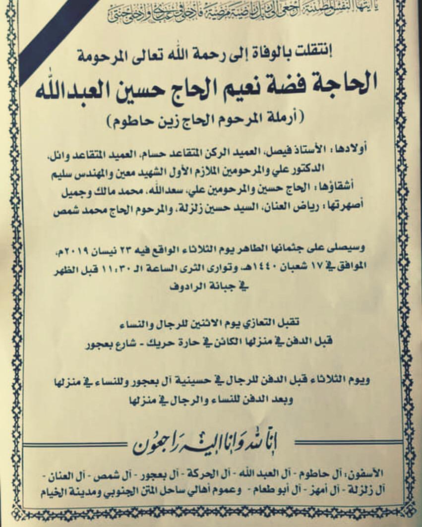 أرملة المرحوم / زين سليم موسى حاطوم (أبو فيصل)