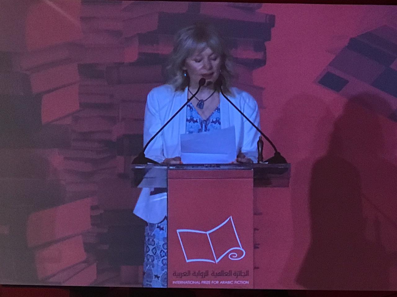 هدي بركات أثناء تكريمها لوصول لرواية بريد الليل للقائمة القصيرة لجائزة البوكر