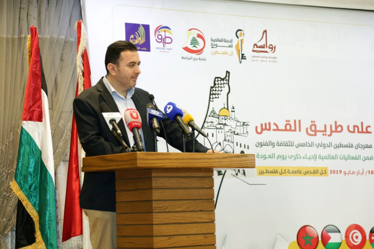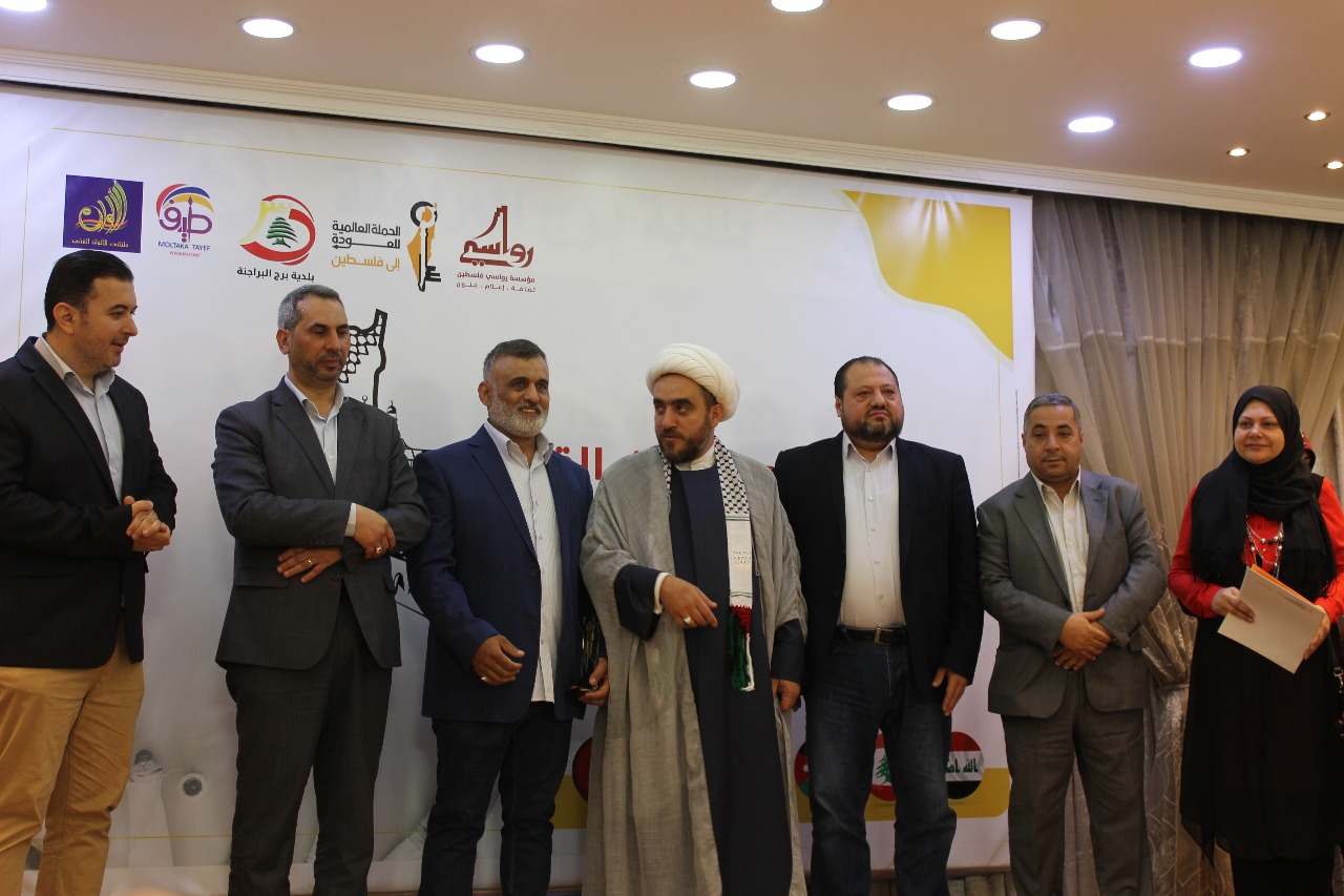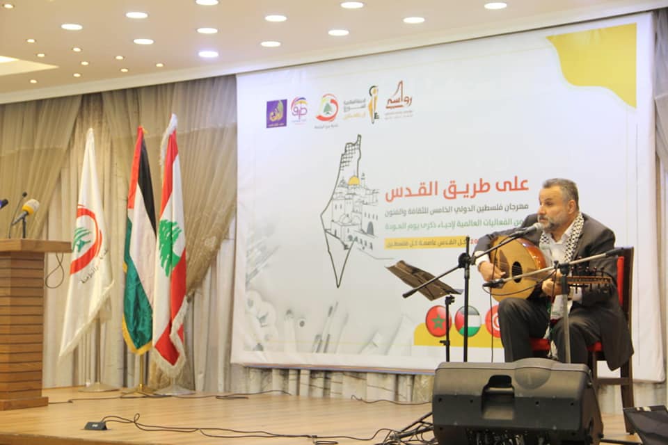 في اجواء ذكرى العودة نظم ملتقى الألوان الفني وملتقى طيف مهرجان فلسطين الدولي الخامس للثقافة والفنون بعنوان “على طريق القدس” برعاية عضو كتلة الوفاء للمقاومة النائب ايهاب حمادة وبلدية برج البراجنة بالتعاون مع الحملة العالمية للعودة ومركز رواسي-فلسطين .