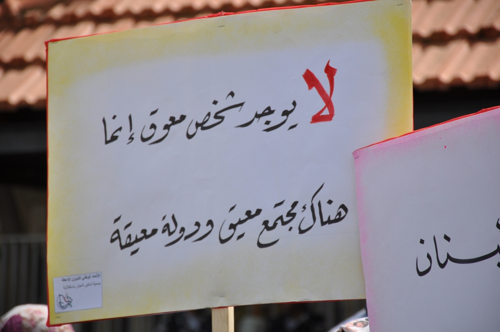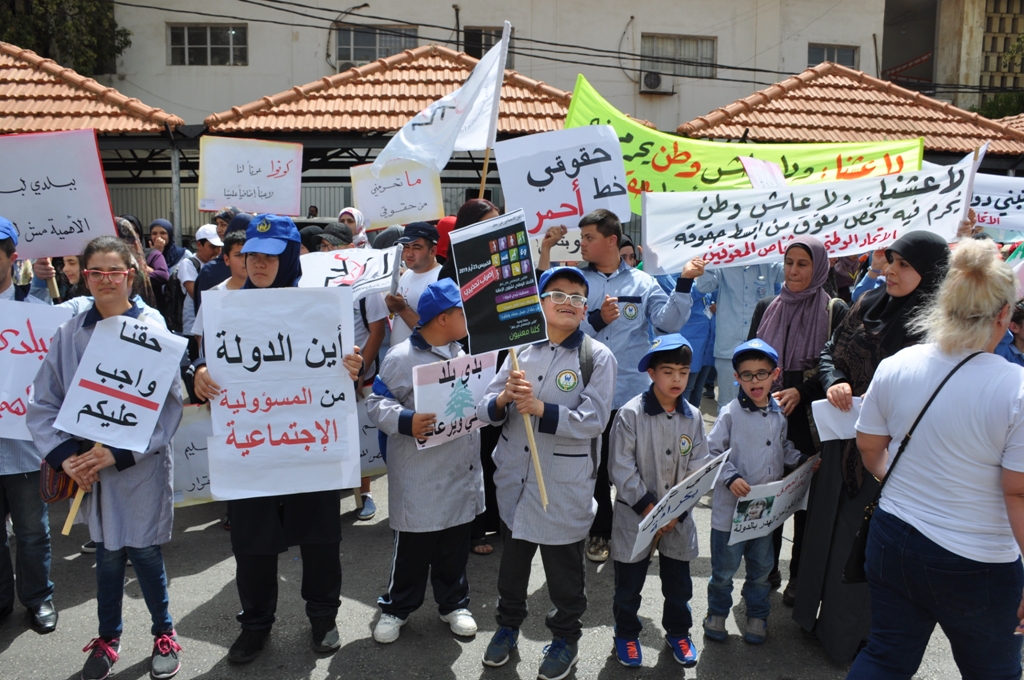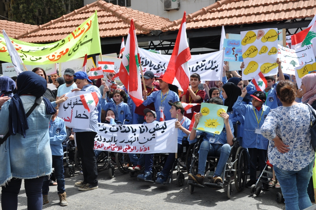 نظم الاتحاد الوطني لشؤون الاعاقة وجمعيتي " تمكين للعيش باستقلالية "، وجمعية المنى التخصصية " عيون " البراءة اعتصاما مع طلاب وطالبات المدارس التي تتبع للجمعيتين امام السراي الحكومي في النبطية استنكارا على تقليص ميزانية وزارة الشؤون الاجتماعية في الموازنة .