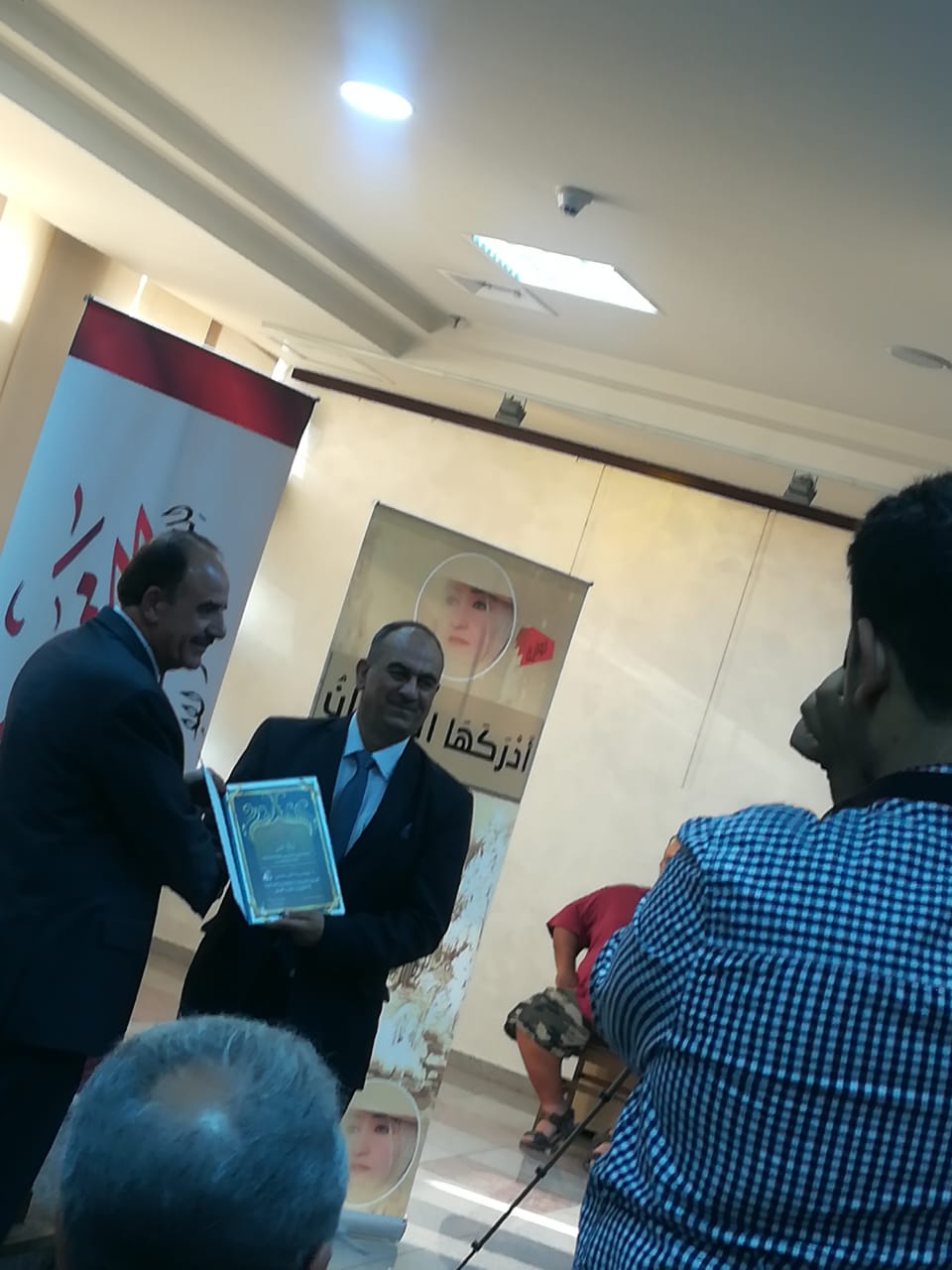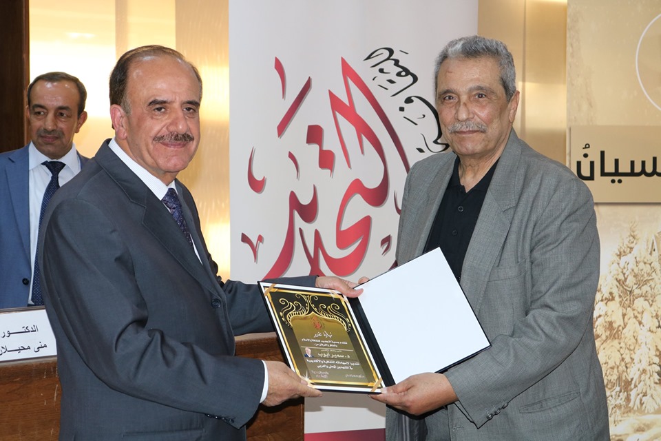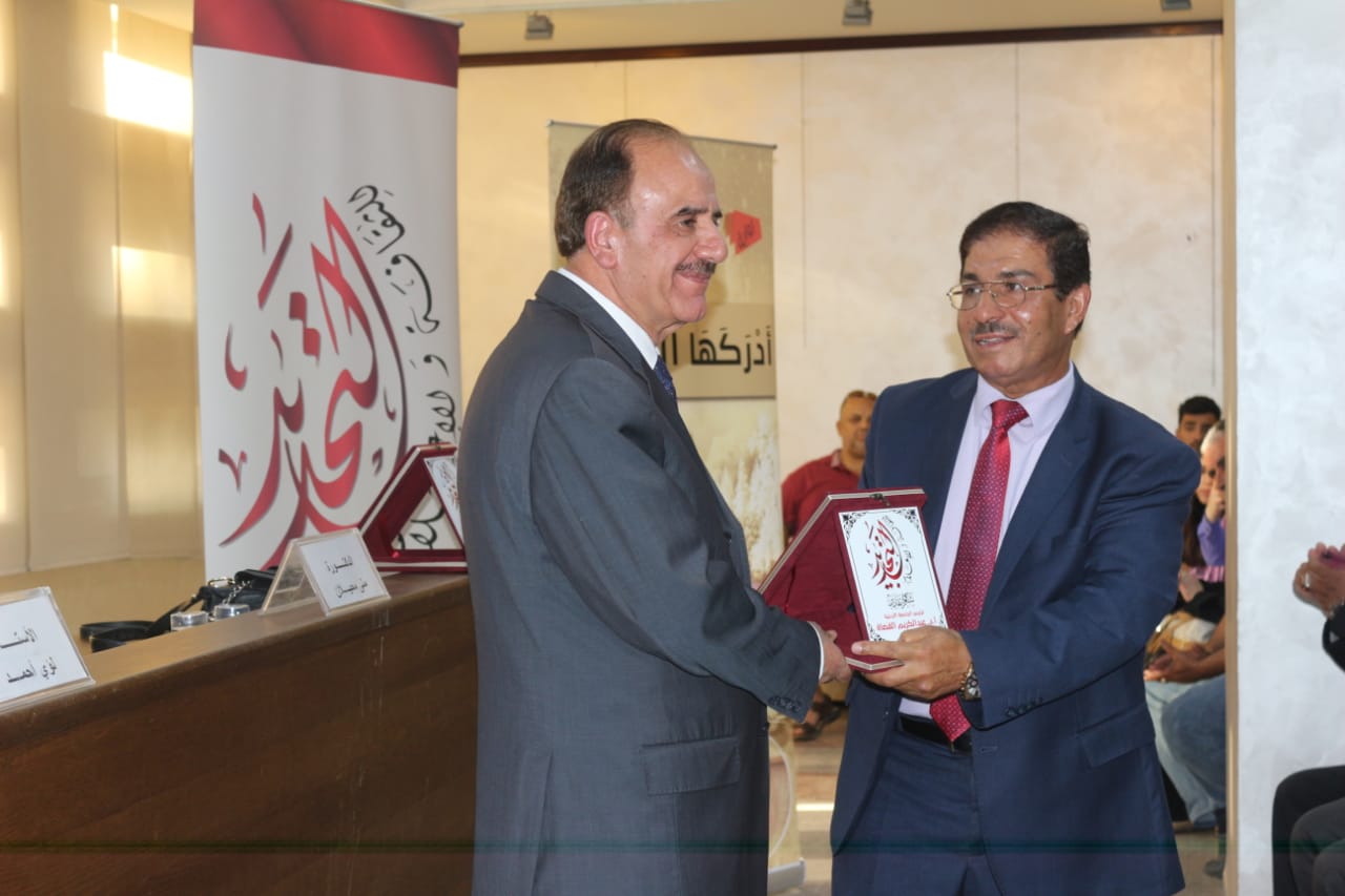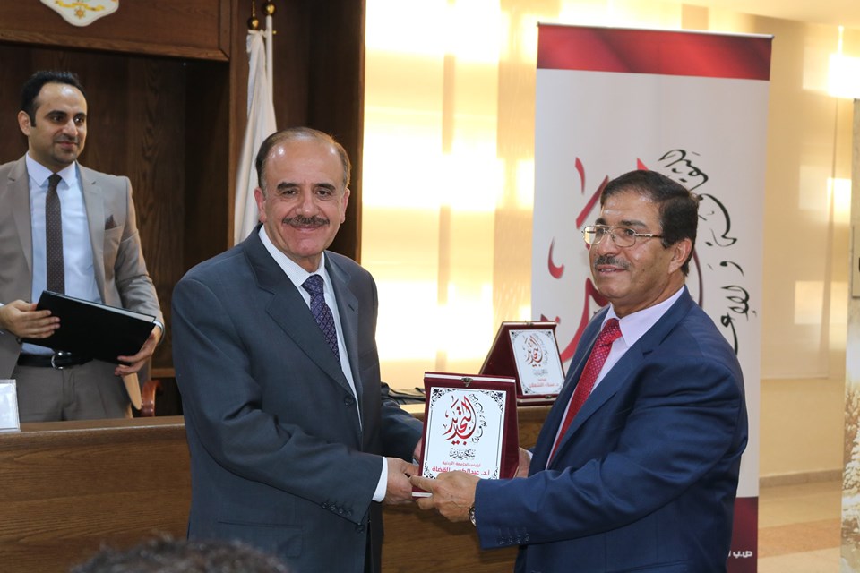 وقد قام الأستاذ الدكتور ربحي عليّان بتقديم درع الجمعيّة التّكريميّ للأستاذ الدّكتور عبد الكريم القضاة باسم الجمعيّة وأعضائها ولجانها وهيئتها الإداريّة.