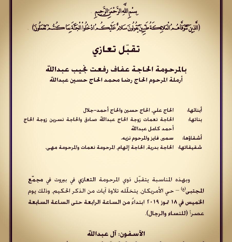 هذا وسيتم تقبل واجبات العزاء في بيروت يوم الخميس الموافق (18 تموز 2019)، من الساعة الرابعة عصراً حتى الساعة السابعة مساءً للرجال والنساء في قاعة الحاج حسن حبيب السلمان في مجمع الامام المجتبى(ع) بحي الأميركان.