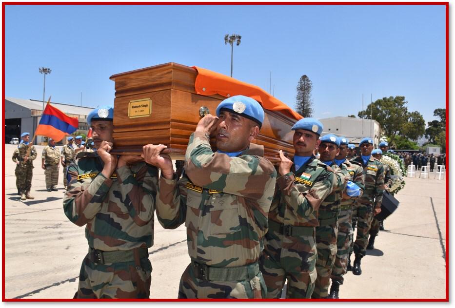 في احتفال رسمي، أدى عناصر من اليونيفيل والجيش اللبناني التحية العسكرية للراحل الرقيب راميش سينغ من الكتيبة الهندية العشرين الذي انتقل الى رحمته تعالى نهارالأربعاء الواقع في 10 تموز 2019.