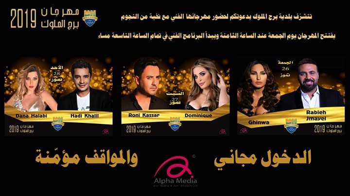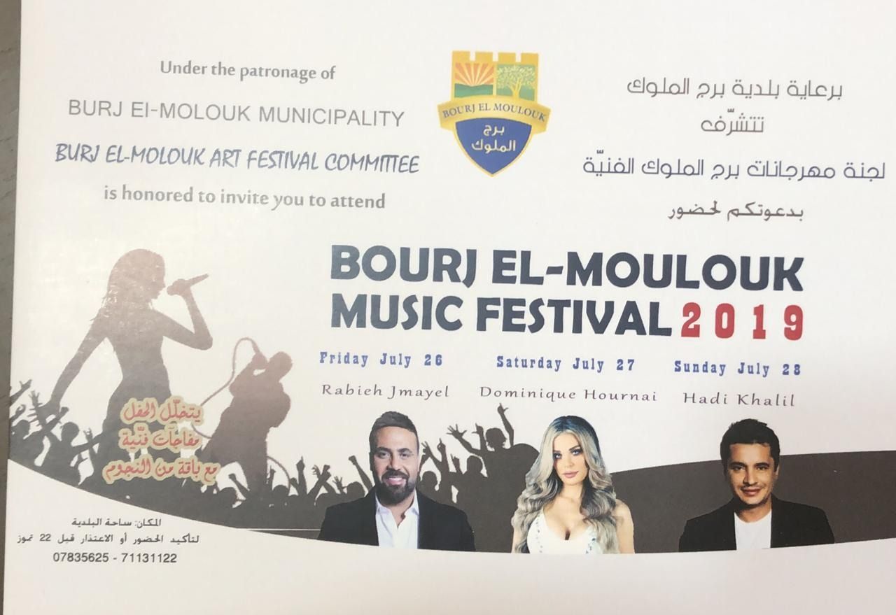 برعاية بلدية برج الملوك، دعت لجنة مهرجانات برج الملوك لحضور مهرجاناتها التي تستمر لمدة ثلاثة ايام ابتداء من يوم الجمعة المقبل 26-7-2019 الساعة التاسعة مساءً.
