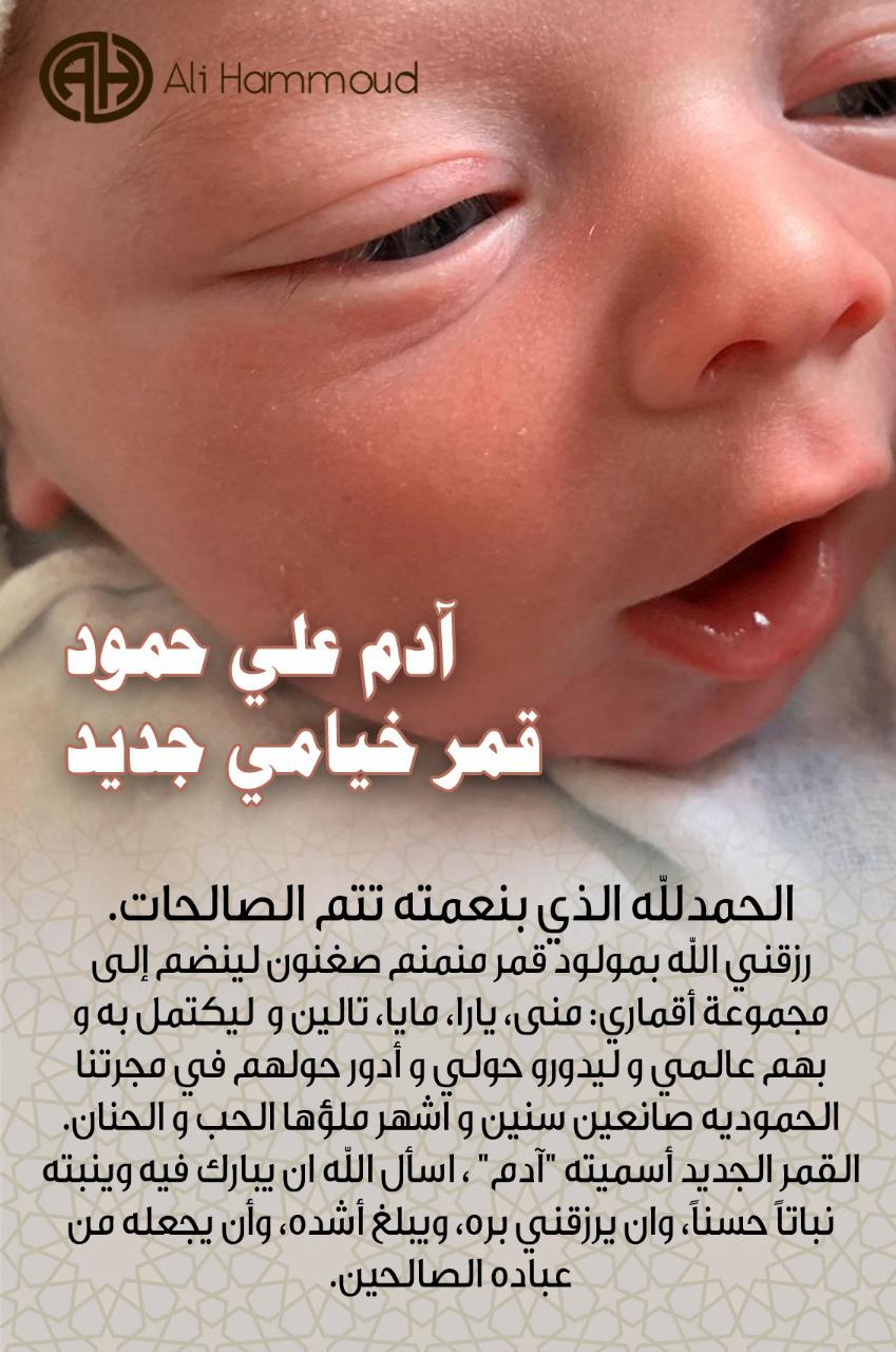 القمر الجديد أسميته "آدم"، اسأل الله ان يبارك فيه وينبته نباتاً حسناً، وان يرزقني بره، ويبلغ أشده، وأن يجعله من عباده الصالحين.