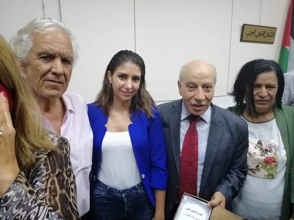 الاستاذة الجامعية الدكتورة هيفاء الإمام تحدثت عن المكرمة نائب رئيس اللجنة التنفيذية للمنتدى القومي العربي الدكتورة نشأت الخطيب فقالت الدكتورة نشأت الخطيب هي سيدة مختارة من بينكم لتكون ايقومة العمل الوطني الواعي بما قدمته من رسالة علم وثقافة وبتشبثها المؤكد باحقية الدرب نحو الحق حق الامة حق الوطن بالسيادة والحرية والوحدة، لان الامانة كل لا يتجزأ فقد جمعت الدكتورة نشأت بين الأمانتين(امانة أم وامانة امة) .