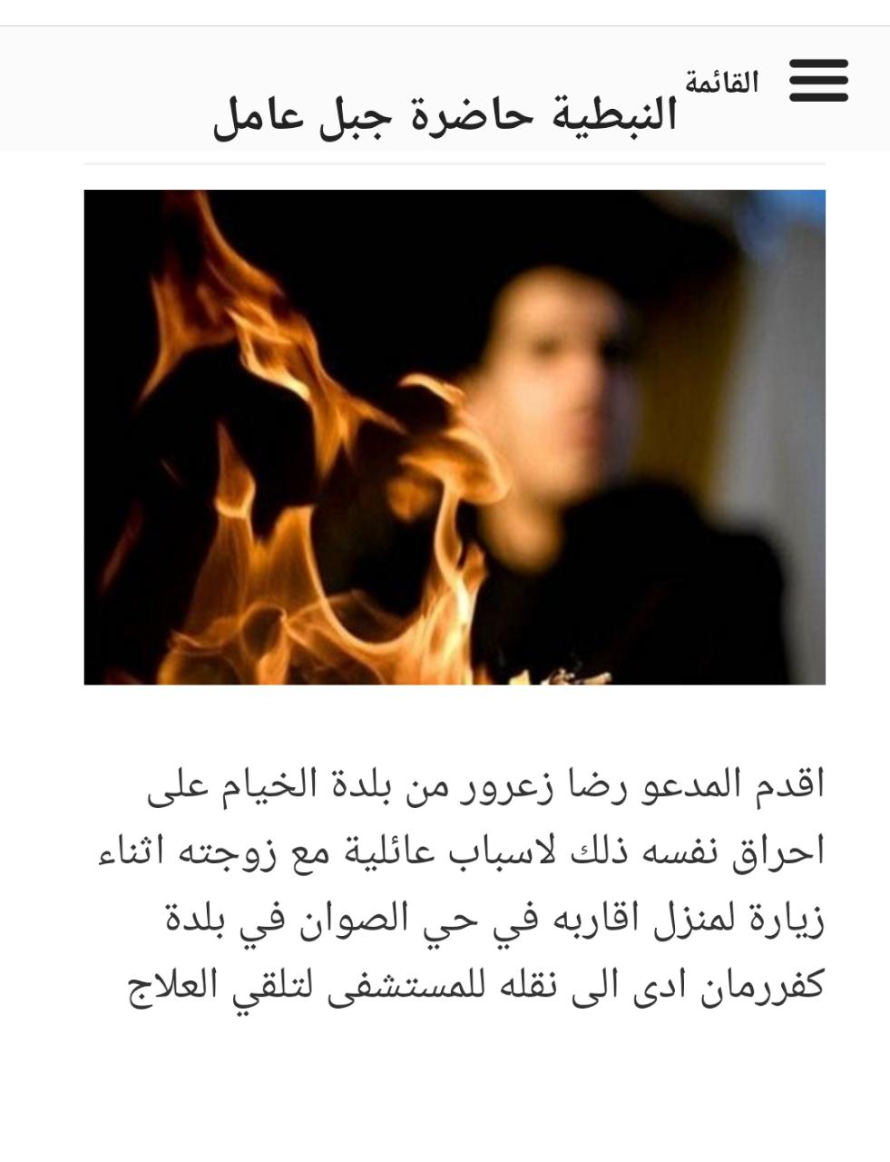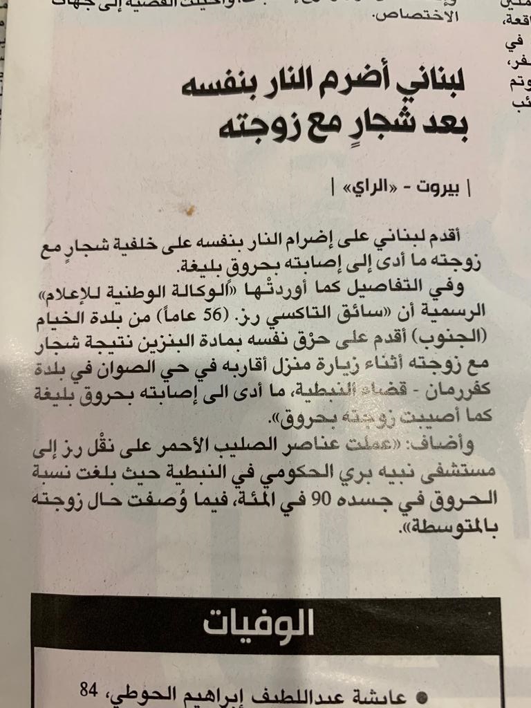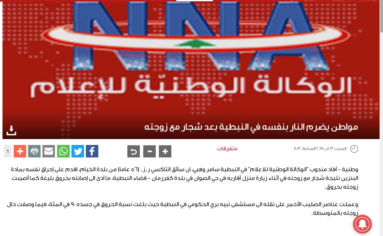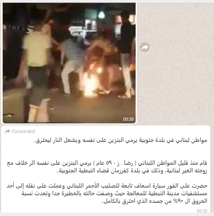 جرى التداول عبر مواقع التواصل بخبر يفيد «إقدام شخص من الخيام (يدعى رضا ز. 59 عام) على محاولة إحراق نفسه بمادة البنزين، في بلدة كفرمان، جراء خلافات مع زوجته الغير لبنانية» (كما جاء في الخبر).