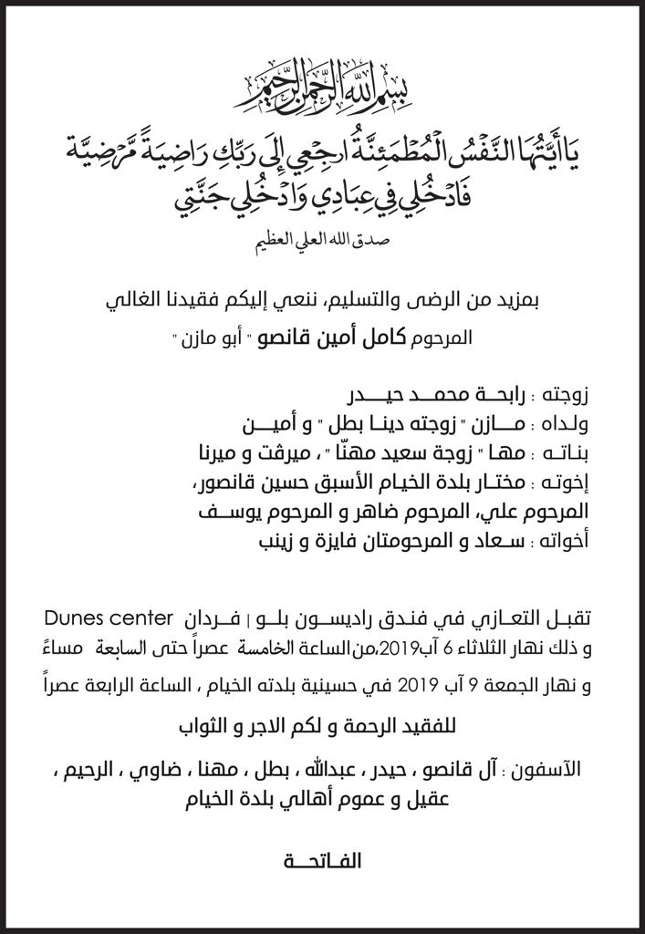 تتقبّل العائلة التعازي تهار الثلاثاء 6 آب 2019 في بيروت بفندق راديسون بلو فردان Dunes Cner من الخامسة عصراً حتى السابعة مساءً