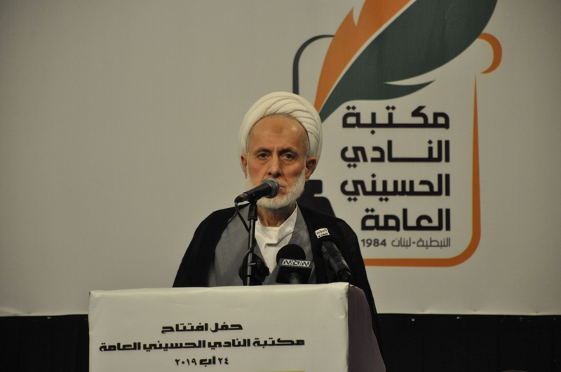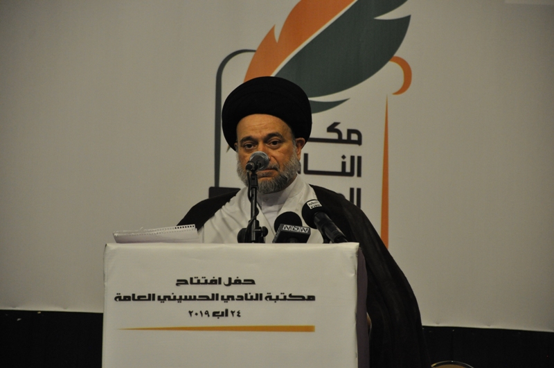 بعد آي من الذكر الحكيم للمقرىء وجدي حوماني والنشيد الوطني ونشيد النادي الحسيني وكلمة لاسماعيل توبة، ألقى امام مدينة النبطية ومفتيها الشيخ عبدالحسين صادق كلمة تحدث فيها عن فوائد المطالعة وميزاتها وعن تاريخ المكتبة ونشاطاتها الثقافية. وقال: "اليوم توقد مكتبة النادي الحسيني في جنوبنا الحبيب شمعة متواضعة على طريق القراءة والثقافة مؤمنة أن الشعب الذي اجترح المعاجز في ميدان القتال قادر على اجتراحها في الميدان الثقافي".