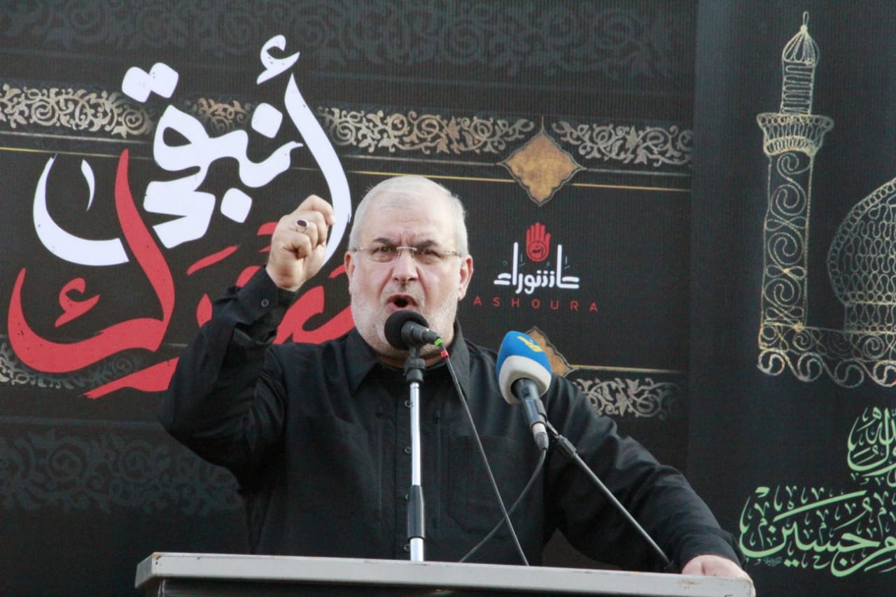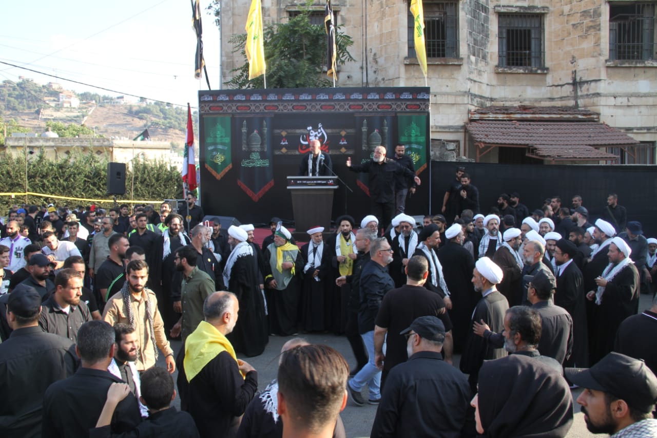 وقال: قضية الحسين اليوم هي قضية وقف العدوان والتحالف العدواني على اليمن ، قضية الحسين اليوم هي قضية الحفاظ على سيادتنا في هذا البلد لبنان ، قضية الحسين اليوم هي فك الطوق ورفع اليد الاميركية عن العراق وشعبه وقضية الحسين اليوم هي اعادة سوريا موحدة قوية معبرة عن قناعاتها بمحور المقاومة، قضية الحسين اليوم هي استعادة كل الحق السليب لفلسطين ولشعبها ولقضيتها وتقرير حق الشعب الفلسطيني بارادته ، كل ساحة يخوض فيها الحق معركة ضد الباطل هي ساحة كربلاء ، وكل يوم ينتصر فيه رجال ونساء واطفال وشيوخ لقضايا الحق والعدل والخير والحرية والامن والاستقرار للشعوب هي قضية عاشوراء ، كل يوم كربلاء كل ارض عاشوراء
