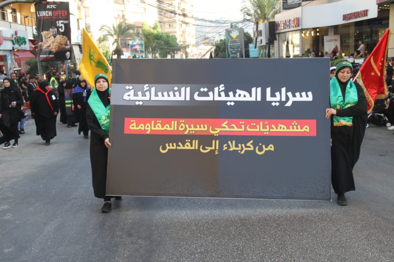 كما سارت خلفهم مواكب حاشدة من الهيئات النسائية وعوائل الشهداء اللواتي حملن صور لابنائهن الشهداء اضافة الى الرايات السوداء والخضراء..