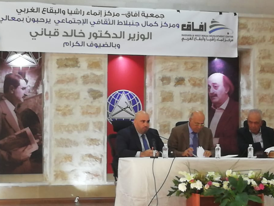 نظمت جمعية آفاق - مركز انماء راشيا والبقاع الغربي، ندوة سياسية بعنوان "اتفاق الطائف وقواعد بناء الدولة والوطن"، برعاية وزير الصناعة وائل أبو فاعور، في مركز كمال جنبلاط الثقافي الاجتماعي في راشيا، حاضر فيها الوزير السابق خالد قباني، وأدارها وقدمها المستشار في وزارة الداخلية خليل جبارة، في حضور ممثل أبو فاعور وكيل داخلية التقدمي رباح القاضي، ممثل النائب محمد القرعاوي خالد صالح، النائبين السابقين أنطوان سعد وناصر نصرالله، قائمقامي راشيا نبيل المصري والبقاع الغربي وسام نسبيه، رئيس اتحاد بلديات جبل الشيخ صالح ابو منصور، رئيس بلدية حاصبيا لبيب الحمرا، نائب رئيس اتحاد بلديات قلعة الاستقلال عصام الهادي، المسؤول عن حركة "أمل" في البقاع الغربي الشيخ حسن اسعد، رئيس جمعية "آفاق" أحمد ثابت، اعضاء المجلس المذهبي الدرزي، وفد من منسقية "تيار المستقبل" في البقاع الغربي وراشيا وممثلين لحزب القوات اللبنانية وحزب الكتائب والجماعة الإسلامية وفاعليات.