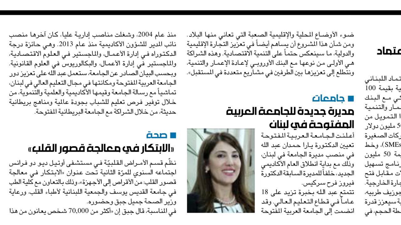 أعلنت الجامعة العربية المفتوحة في لبنان عن تعيين الدكتورة يارا حمدان عبدالله في منصب مديرة الجامعة في لبنان وذلك مع بداية إنطلاق العام الأكاديمي الجديد، ويأتي تعيين الدكتورة عبد الله خلفاً للمديرة السابقة الدكتورة فيروز فرح سركيس.