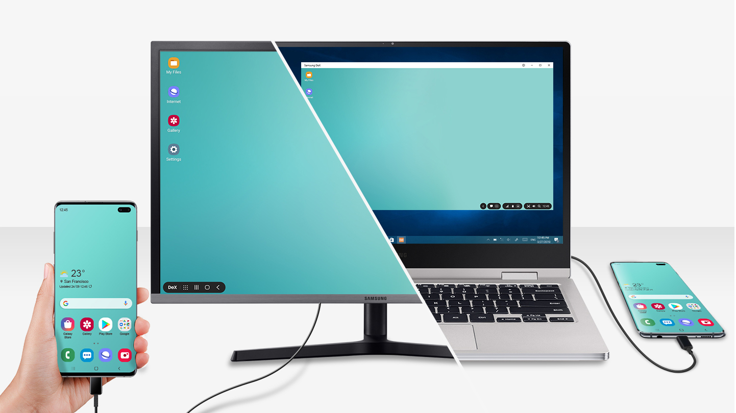 كما يشتمل التحديث على توفير قاعدة Samsung DeX، حيث سيتمكن المستخدمون من تحميل التطبيق على SamsungDeX.com ، وبالتالي تشغيل القاعدة على أجهزة الكمبيوتر الشخصية أو أجهزة ماك بسلاسة، عن طريق توصيل Galaxy S10 بحواسيبهم عن طريق استخدام كابل USB. ويوفر التحديث اتصال سريع بنظام ويندوز مباشرة في لوحة الاختصارات السريعة حيث يمكن لمستخدمي هواتف GalaxyS10 بنقرة واحدة، الاتصال بجهاز كمبيوتر يعمل بنظام ويندوز 10، ويمكنهم من هناك رؤية الإخطارات وإرسال واستقبال الرسائل ومراجعة الصور الحديثة من أجهزة الكمبيوتر الخاصة بهم.