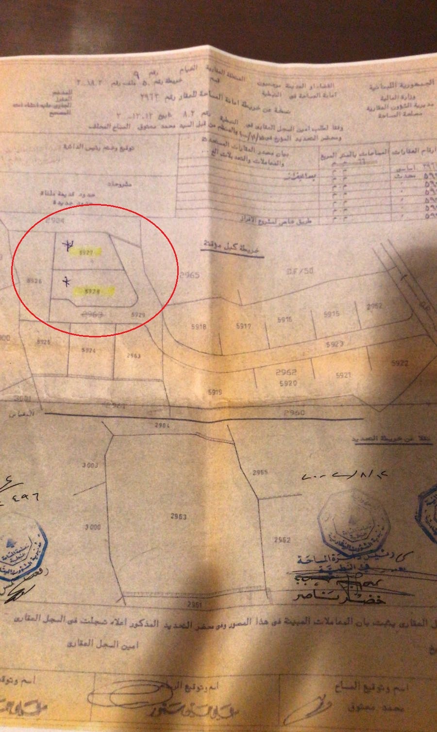 أرقام العقارين: 5927 (مساحته 829 م م) و5928 (مساحته 914 م م) ضمن منطقة الخيام العقارية).