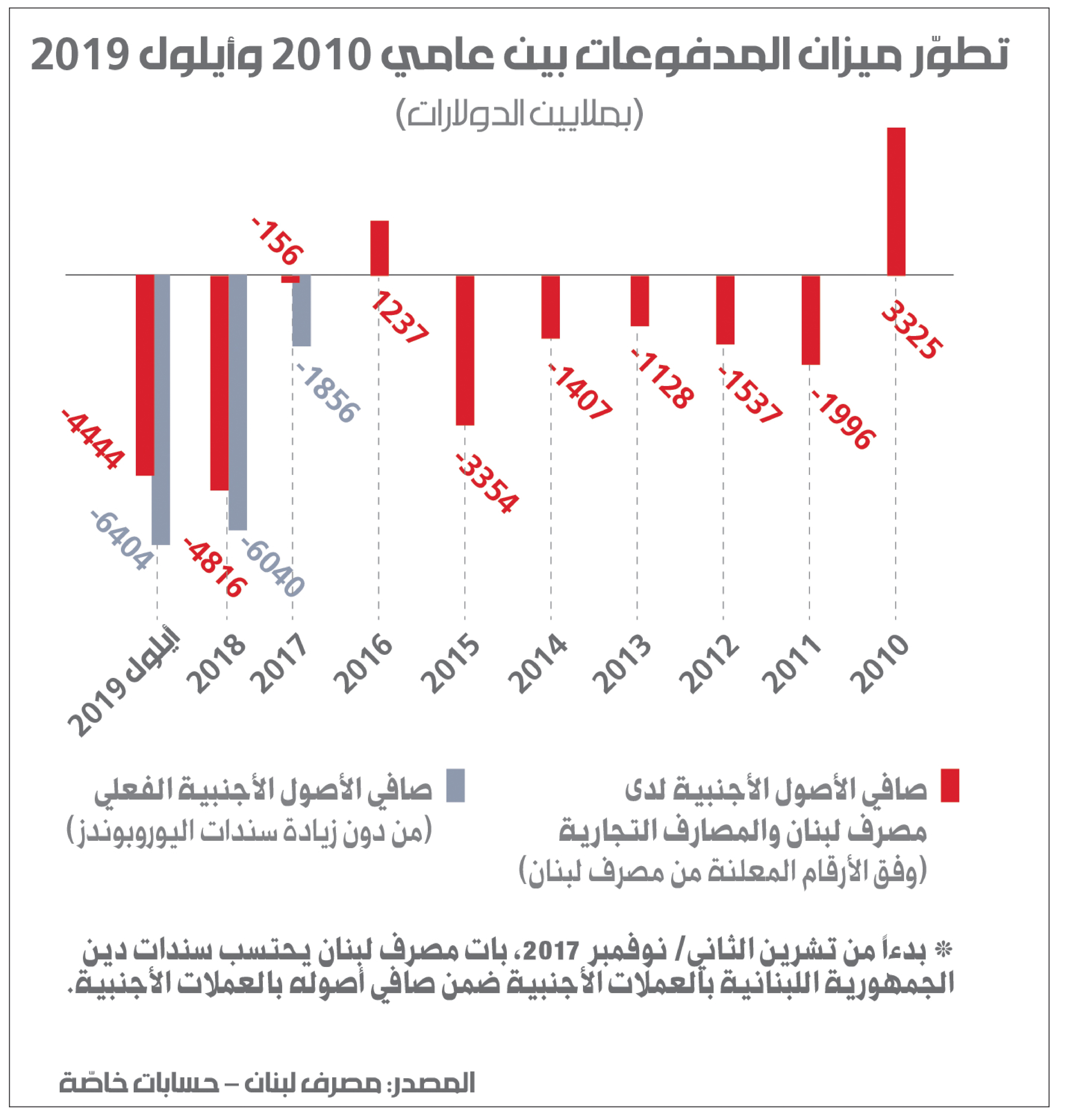بلغ العجز المُسجّل في ميزان المدفوعات، حتى أيلول 2019، نحو 4.4 مليارات دولار، وفقاً لحسابات مصرف لبنان، وهو أقل بنحو 400 مليون دولار من العجز المُسجّل طوال السنة الماضية والذي بلغ 4.8 مليارات دولار، وفقاً للحسابات نفسها.