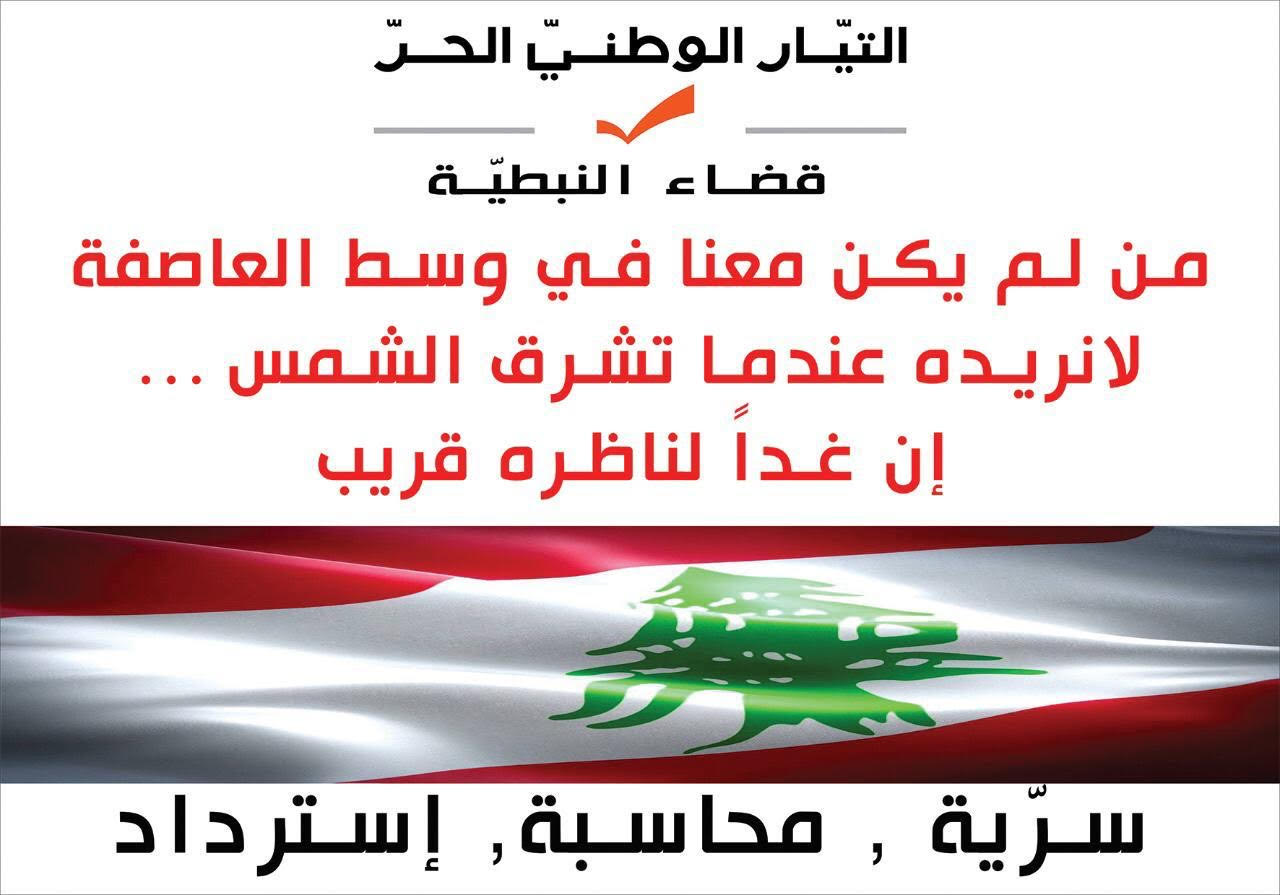 انطلق صباح اليوم موكب هيئة قضاء النبطية في التيار الوطني الحر من امام مكتب التيار على اوتوستراد حبوش -النبطية للمشاركة في يوم الوفاء امام قصر بعبدا، دعما لمواقف رئيس الجمهورية العماد ميشال عون.