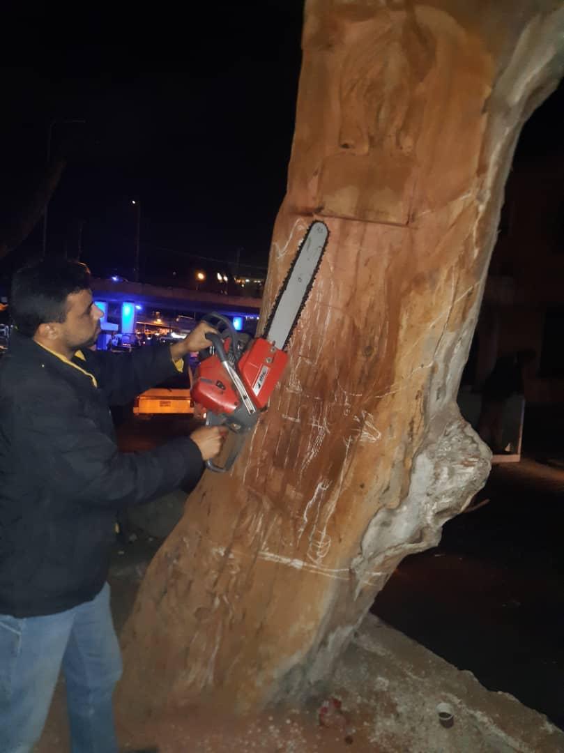 بعد ضغط أثاره رافضو نحت لوحة تمثل الآلهة السورية عشتار على جذع شجرة وسط دمشق تدخل منشار كهربائي ليحسم الجدل ويزيل الجسد عن الرأس.