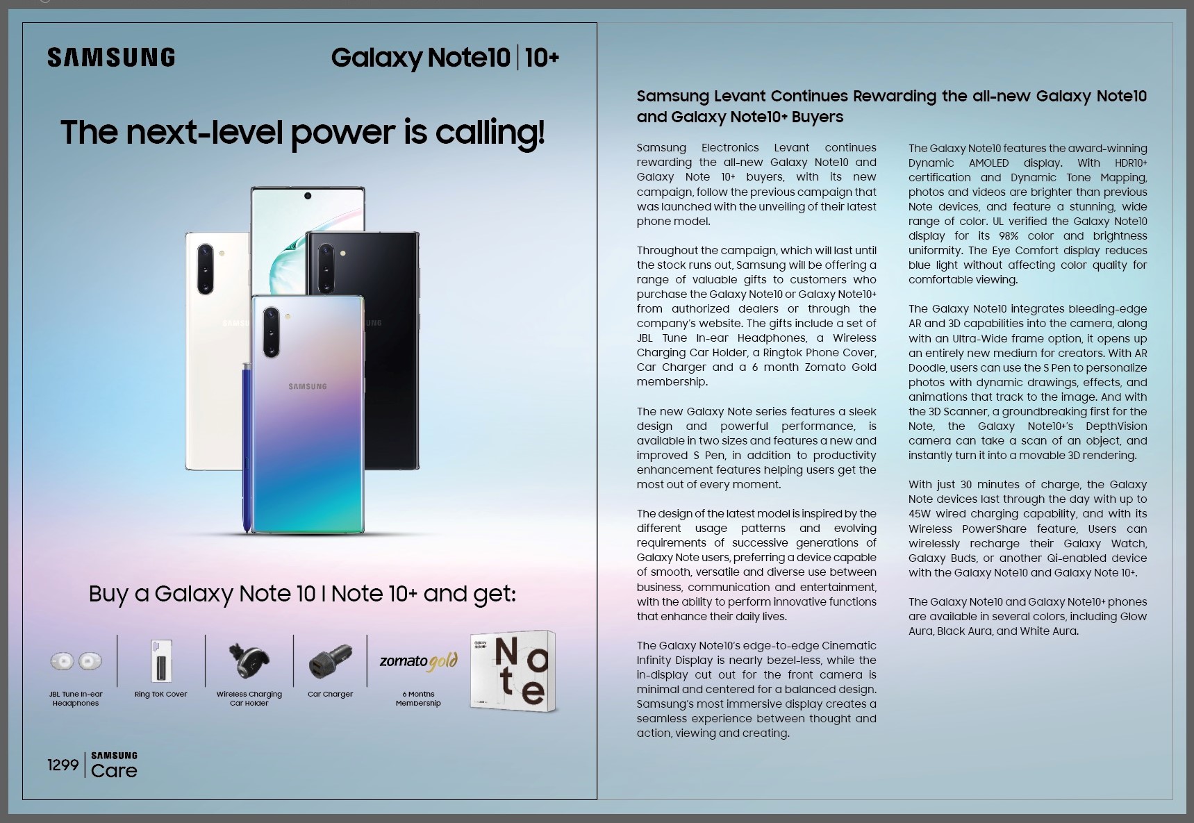 (عمّان، 10 كانون الأول 2019): تواصل شركة "سامسونج إلكترونيكس" المشرق العربي مكافأة مشتري هاتفها الجديد كلياً Galaxy Note 10، بطرازيه، الطراز الأساسي Note 10، وطراز Note 10+، وذلك مع حملتها التقديرية الجديدة، التي تستكمل بها الحملة السابقة التي ترافقت مع طرح الهاتف.