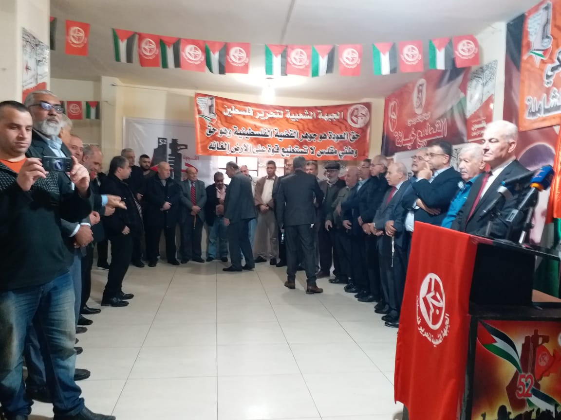 في الذكرى الثانية والخمسين لانطلاقة الجبهة الشعبية لتحرير فلسطين، استقبلت الجبهة في لبنان، خلال حفلها السنوي المركزي في بيروت، بمخيم مارالياس، في قاعة الشهيد أبو علي مصطفى، يوم الأربعاء 18/12/2019 وفودًا سياسية، وأعلامية، وممثلين عن الفصائل والأحزاب الوطنية، والإسلامية، فلسطينية ولبنانية: المناضل كمال شاتيلا على رأس وفد من المؤتمر الشعبي اللبناني، المناضل معن بشور، العميد مصطفى حمدان على رأس وفد من حركة الناصريين (المرابطون)، العميد وائل حسنية على رأس وفد من الحزب السوري القومي الاجتماعي ،الحزب الشيوعي اللبناني، حركة الشعب، وفد من الحزب التقدمي الاشتراكي الدكتور بهاء أبو كروم، جبهة النضال الشعبي الفلسطيني، وفد من الأسرى المحررين احمد طالب وعباس قبلان، وفد من رابطة الشغيلة حسن حردان، كاسترو عبد الله، السفير الكوبي في لبنان، القائم بأعمال السفارة الفنزويلية في لبنان عميرة زبيب، جمعية النجدة الاجتماعية،علي محيي الدين، جمال فياض دائرة شؤون اللاجئين الفلسطسنيين، الجبهة العربية الفلسطينية، أنصار الله، وفد من حركة فلسطين حرة، خالد عبادة المجلس الأعلى للشباب والرياضة، جبهة التحرير الفلسطينية، الأستاذ رمزي منصور قنصل سفارة فلسطين في لبنان، وفد من لجنة المتابعة للجان الشعبية الفلسطينية في لبنان، مدير مخيم مار الياس ناصر صالح، وفد من حركة التحرير الفلسطينية فتح، الاستاذ عصام طناني، وفد من الجبهة الشعبية القيادة العامة، مهدي مصطفى الحزب العربي الديمقراطي، الدكتور عبد الملك سكرية، وفد من الجبهة الديمقراطية لتحرير فلسطين، ليليان حمزة الحزب الديمقراطي اللبناني، الشيخ عطالله حمود حزب الله، غسان عبد الغني مدير الضمان الفلسطيني في لبنان، المناضل صلاح صلاح، المناضل ابو مجاهد، وفد من المهندسين الفلسطينيين، وفد من موظفي الاونروا، وفد من حركة الجهاد الإسلامي في فلسطين، وفد من حركة المقاومة الإسلامية حماس، وفد من وجهاء وفاعليات مخيم البرج، وفد من فاعليات ووجهاء شاتيلا، وفد من فاعليات ووجهاء مار الياس، الأستاذ يحيى المعلم، وفد من حركة فدا، الدكتور أحمد علوان رئيس حزب الوفاء، العقيد بلال السرواني مسؤول القوة الأمنية في البرج، وفد من حركة الانتفاضة الفلسطينية، وفد من الأمن الوطني الفلسطيني، وفد من جبهة التحرير الفلسطينية، وفد من اللجنة الشعبية الفلسطينية في مار الياس، وفد من اللجنة الشعبية في شاتيلا، وفد من اللجنة الشعبية في برج البراجنة، وفد من اتحاد عمال فلسطين، وفد من جبهة النضال الشعبي الفلسطيني، وفد من حركة التحرير الوطني الفلسطيني فتح الانتفاضة، الدكتور ناصر حيدر، وفد من جبهة التحرير الفلسطينية، وفد من حزب الشعب الفلسطيني