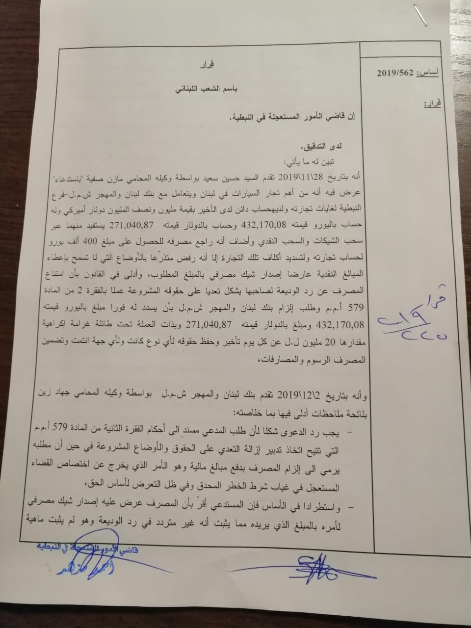 أنه بتاريخ 28112019 تقدم السيد حسين سعيد بواسطة وكيله المحامي مازن صفية "باستدعاء عرض فيه أنه من أهم تجار السيارات في لبنان ويتعامل مع بنك لبنان والمهجر- فرع النبطية لغايات تجارته ولديه حساب دائن لدى الأخير بقيمة مليون ونصف المليون دولار أميركي وله حساب باليورو قيمته 432,170, 08 وحساب بالدولار قيمته 271,040, 87 يستفيد منهما عبر سحب الشيكات والسحب النقدي وأضاف أنه راجع مصرفه للحصول على مبلغ 400 ألف يورو لحساب تجارته ولتسديد أكلاف تلك التجارة إلا أنه رفض متذرعا بالأوضاع التي لا تسمح بإعطاء المبالغ النقدية عارضا إصدار شيك مصرفي بالمبلغ المطلوب، وأدلي في القانون بأن امتناع المصرف عن رد الوديعة لصاحبها يشكل تعديا على حقوقه المشروعة عملا بالفقرة 2 من المادة 579 أ.م.م وطلب إلزام بنك لبنان والمهجر ش.م.ل بأن يسدد له فورا مبلغ باليورو قيمته 432,170, 08 ومبلغ بالدولار قيمته 271,040,87 وبذات العملة تحت طائلة غرامة إكراهية مقدارها 20 مليون ل.ل عن كل يوم تأخير وحفظ حقوقه لأي نوع كانت ولأي جهة انتمت وتضمين المصرف الرسوم والمصارفات،