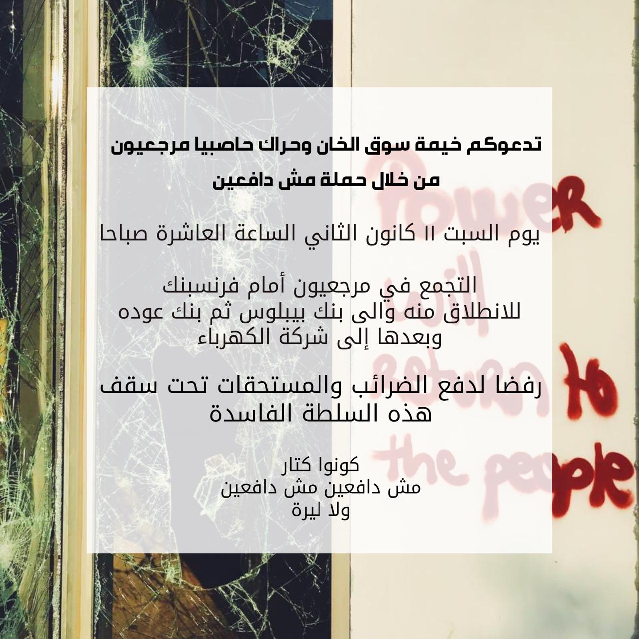 تحت شعار «مش دافعين»، دعت خيمة سوق الخان وحراك حاصبيا مرجعيون للتجمّع عند العاشرة صباح يوم غدٍ السبت 11 كانون الثاني الجاري، أمام فرنسبنك في جديدة مرجعيون للانطلاق منه والى بنك بيبلوس ثم بنك عوده وبعدها إلى شركة الكهرباء، وأن ذلك رفضاً لدفع الضرائب والمستحقات...
