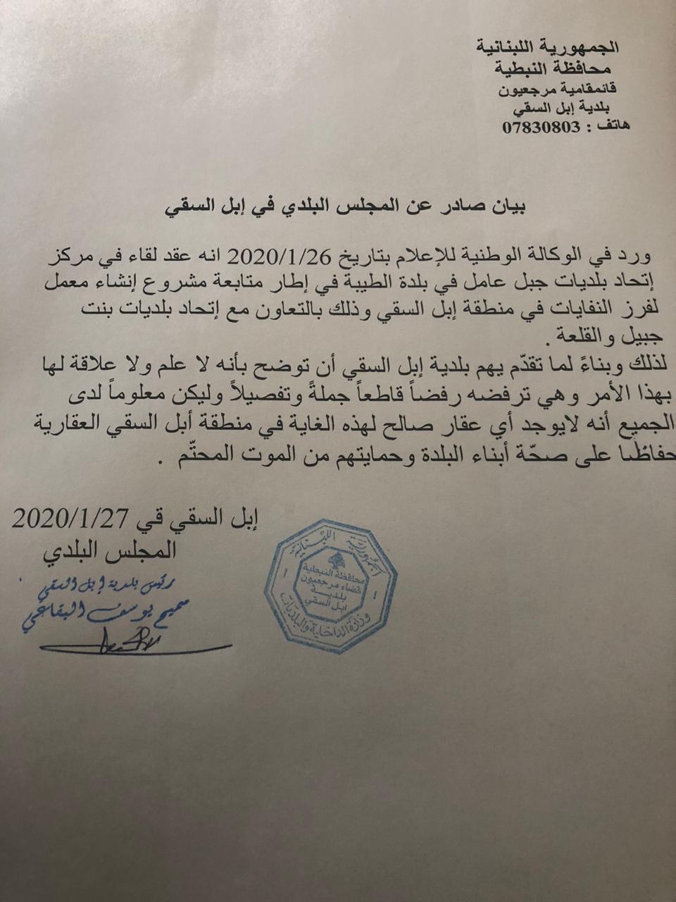 فور ذلك أصدرت بلدية ابل السقي بياناً أكدت فيه رفضها لهذا الامر رفضا قاطعا جملة وتفصيلا ورفضها لتخصيص اي عقار صالح لهذه الغاية في منطقة ابل السقي العقارية حفاظا على الصحة العامة وحماية أبناء المنطقة من الموت المحتم.