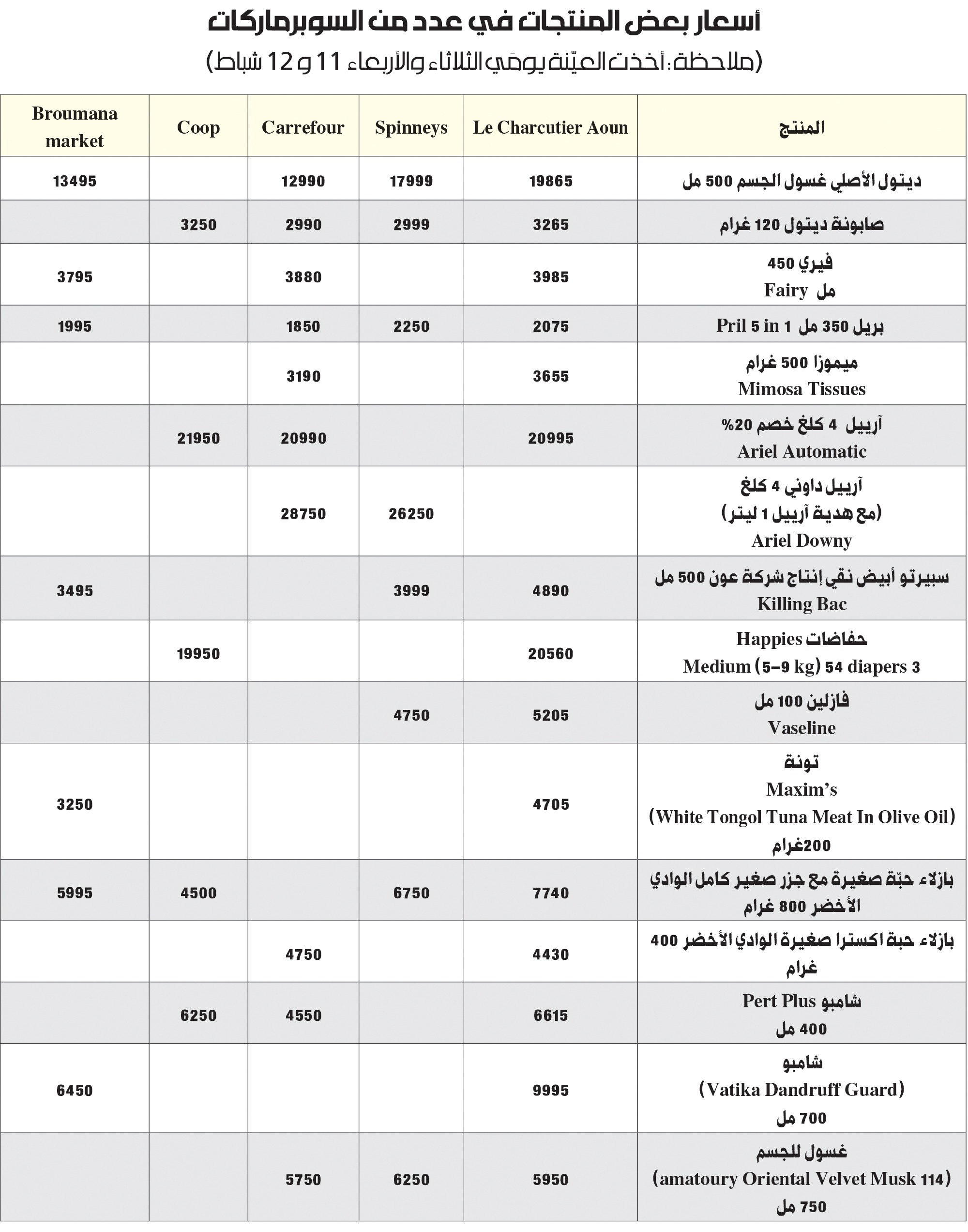 هذه وغيرها تبيّنها جولة سريعة على عدد من محال السوبرماركت في محاولة لمقارنة أسعار بعض المنتجات، علماً بأن اختيار المحال والمنتجات كان عشوائياً وغير مستند إلى أي معلومات مسبقة أو شكاوى، مع الحرص على التدقيق في وزن المنتج وحجمه، وخصوصاً أن بعض الفروقات الطفيفة أحياناً قد تؤثر بشكل جذري على الخلاصات (مثلاً صابونة من العلامة التجارية نفسها تتوافر بحجم 120 غراماً و125 غراماً وهو أمر يستحيل تمييزه بالعين المجردة).