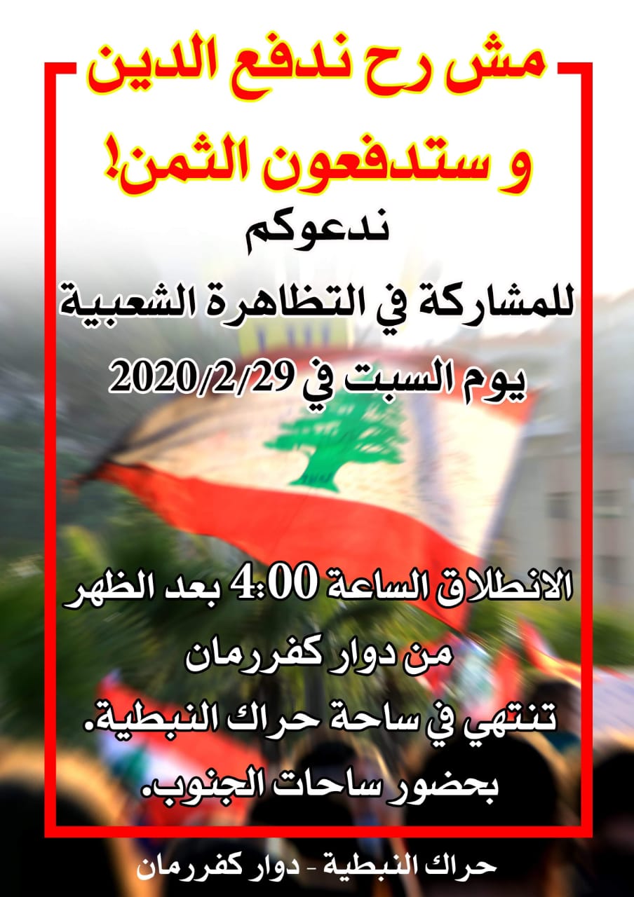 تحت عنوان «ستدفعون الثمن» دعا ناشطون يوم أمس إلى مسيرة تجول شوارع بيروت بعد ظهر يوم السبت القادم 29 شباط 2020.