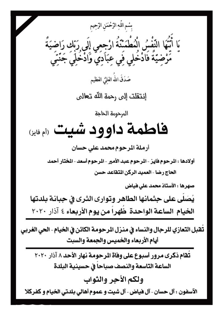 وتُقام ذكرى الأسبوع عن روح الفقيدة نهار الأحد 8 الجاري عند التاسعة والنصف صباحاً في حسينية بلدتها الخيام.