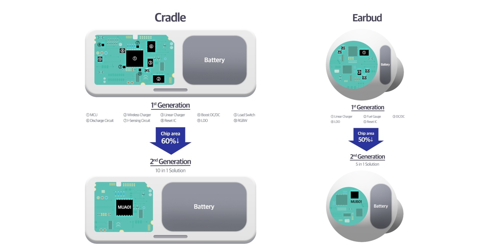 وتم تصميم دوائر إدارة الطاقة المتكاملة MUA01 وMUB01، على التوالي، لتعزيز كفاءة قاعدة الشحن وسماعات الأذن، وهي حلول متكاملة وفريدة من نوعها تم تحسينها لأجهزة TWS. ومن خلال الجمع بين العديد من تقنيات الشركة، تمكنت شركة سامسونج من دمج ما يصل إلى عشرة مكونات منفصلة في عنصر واحد، بما في ذلك تبديل الشواحن ودوائر التفريغ، مما يمكّن دارة إدارة الطاقة المتكاملة من شغل أقل من نصف المساحة مقارنة بالبدائل السابقة. ويمكن للحلول المدمجة تخصيص مساحة أكبر للبطارية لوقت تشغيل أطول وتمكين تصميمات أكثر مرونة وفعالية.