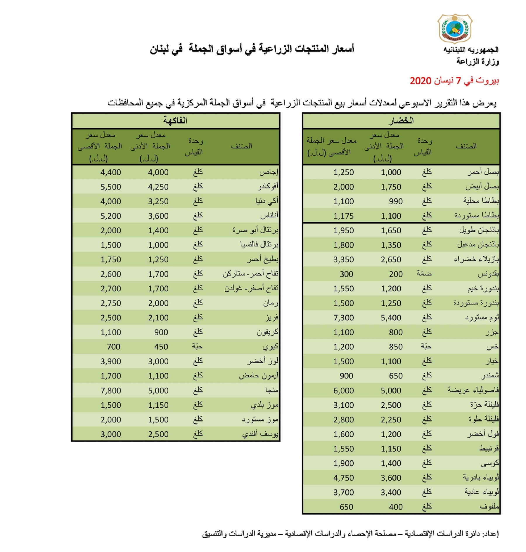 أمس، أطلقت وزارة الزراعة اللائحة الأولى للأسعار التوجيهية للمنتجات النباتية في أسواق الجملة، وافتتحت الصفحة الرسمية على موقعها الإلكتروني، والتي يفترض أن تحمل جداول أسبوعية بأسعار هذه المنتجات، ولاحقاً بأسعار المنتجات الحيوانية. تضمّنت اللائحة الأولى 43 منتجاً أساسياً في الاستهلاك اليومي (24 صنفاً من الخُضَر و19 من الفاكهة)، محدّدة إياها ما بين معدّلي سعر، أدنى وأقصى، على أن تتغيّر اللائحة صباح كل أربعاء، تبعاً لتغيّر الأسعار في السوق وتقلبات العرض والطلب.