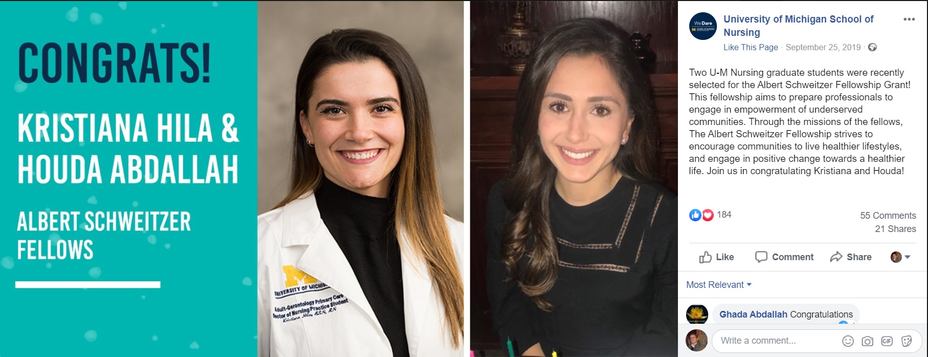 وشقيقتها هدى، التي تحمل شهادة ماجيستر في التمريض تحارب أيضاً في احدى مستشفيات ولاية ميتشغن.