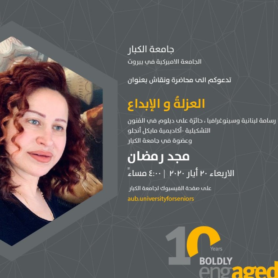 توثيقاً لزمن الكورونا وكيف تعاملنا معه حاضرت الفنانة التشكيلية مجد رمضان افتراضيا عبر النقل المباشر على وسائل التواصل وحملت المحاضرة عنوان "العزلة والإبداع" وتحدثت فيها عن الوجه الإيجابي للعزلة من خلال تدريب مجموعة من السيدات في جامعة الكبار في الجامعة الأميركية في بيروت، وبعد التدريب تم تنظيم معرض الكتروني لنتاج الأعمال. وتخلل المحاضرة عرض شهادات للسيدات المتدربات أشدن فيها بدور الفنانة رمضان وجامعة الكبار . فخورة جداً لانه كان لي شرفُ الإشرافِ و التدريبِ لكوكبةٍ عاليةِ الموهبة من جامعةِ الكبار في الجامعة الأمريكية في بيروت في الفن التشكيلي عبر وسائل التواصل في ظلِّ جائحة كورونا العالمية .. وقالت الفنانة مجد إن" العزلة هي عُزلة الجسد لا عزلة الروح والرسم هو احد وجوه العزلة الجميلة و الفن يقدس العزلةَ و تجعلنا نكتشف ان الموهبةَ طاقةٌ فطريةٌ في النشاط الإنساني و لا تعرف عمرًا محددًا لتلمع". واضافت" كما قلت في محاضرتي السابقة الموهبة لا تدرس لكنها تصقل بالتعليم و لو كان عن بعد ..! إنها الحصانة ضد الصغائر ، ولكن بطريقة افتراضية هذه المرة" .