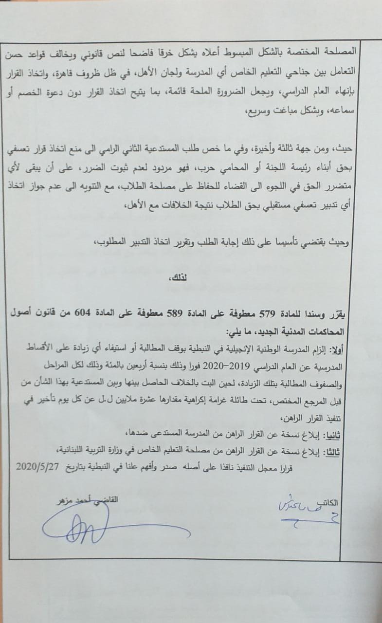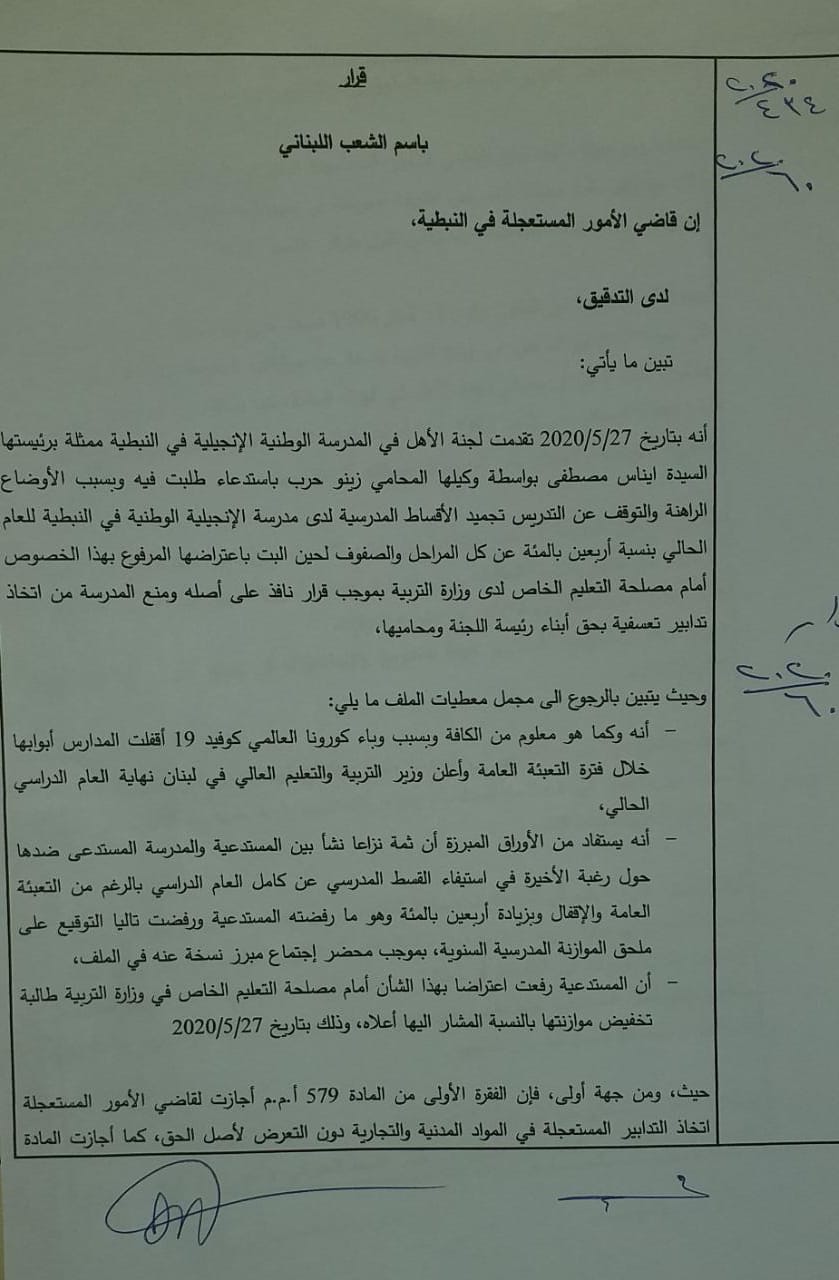 أنه بتاريخ 2020/5/27 تقدمت لجنة الأهل في المدرسة الوطنية الإنجيلية في النبطية ممثلة برئيستها السيدة ايناس مصطفى بواسطة وكيلها المحامي زينو حرب باستدعاء طلبت فيه، وبسبب الأوضاع الراهنة والتوقف عن التدريس، تجميد الأقساط المدرسية لدي مدرسة الإنجيلية الوطنية في النبطية للعام الحالي بنسبة أربعين بالمئة عن كل المراحل والصفوف لحين البت باعتراضها المرفوع بهذا الخصوص.