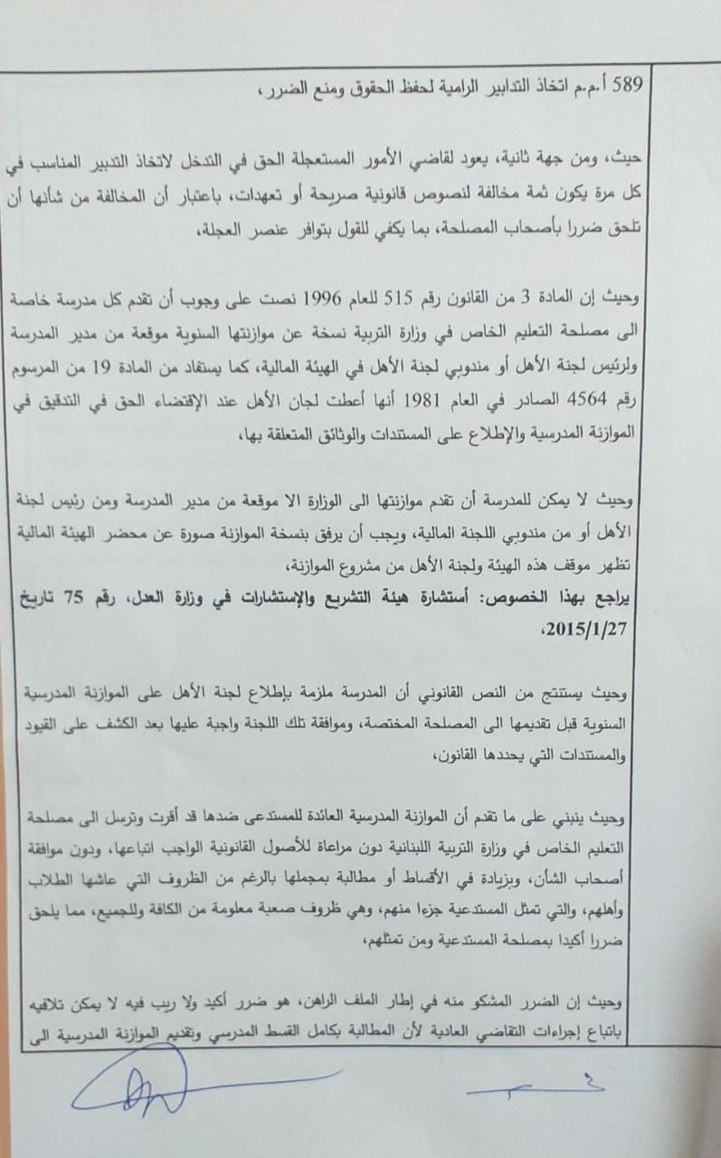 حيث، ومن جهة ثانية، يعود لقاضي الأمور المستعجلة الحق في التدخل لاتخاذ التدبير المناسب في كل مرة يكون ثمة مخالفة لنصوص قانونية صريحة أو تعهدات، باعتبار أن المخالفة من شأنها أن تلحق ضررا بأصحاب المصلحة، بما يكفي للقول بتوافر عنصر العجلة، وحيث إن المادة 3 من القانون رقم 515 ل لعام 1996 نصت على وجوب أن تقدم كل مدرسة خاصة إلى مصلحة التعليم الخاص في وزارة التربية نسخة عن موازنتها السنوية موقعة من مدير المدرسة ولرئيس لجلة الأهل أو مندوبي لجنة الأهل في الهيئة المالية، كما يستفاد من المادة 19 من المرسوم رقم 4564 الصادر في العام 1981، أنها أعطت لجان الأهل عند الإقتضاء الحق في التدقيق في الموازنة المدرسية والإطلاع على المستندات والوثائق المتعلقة بها،