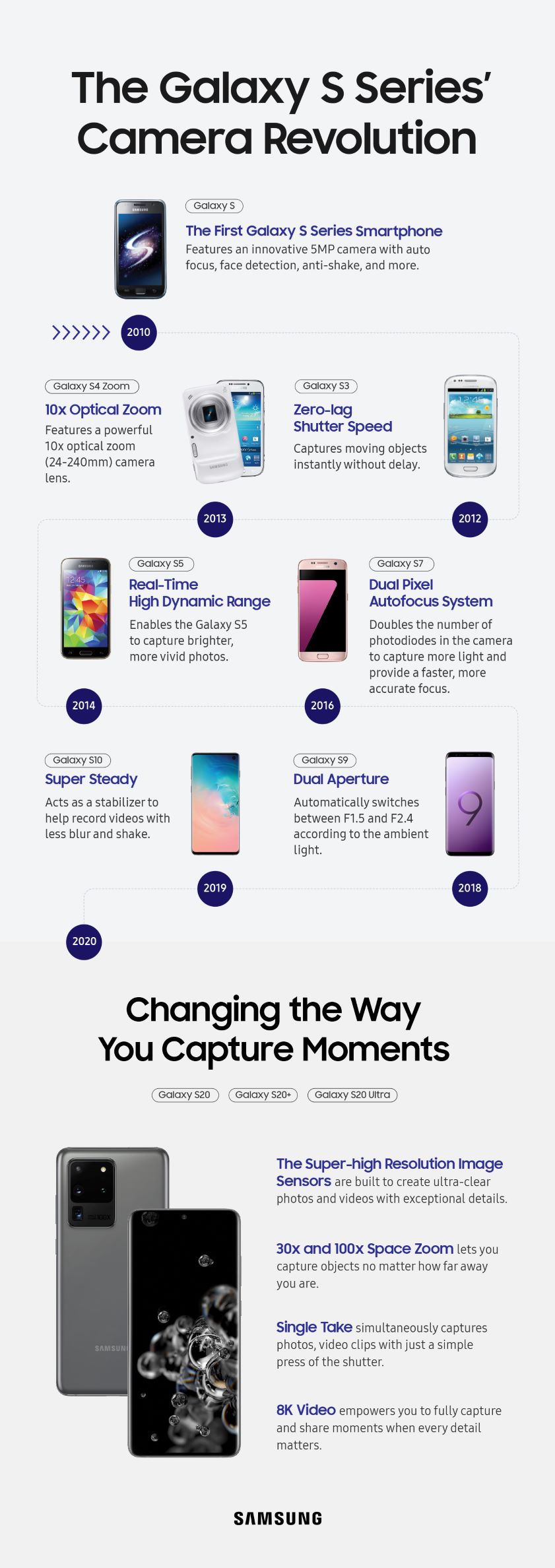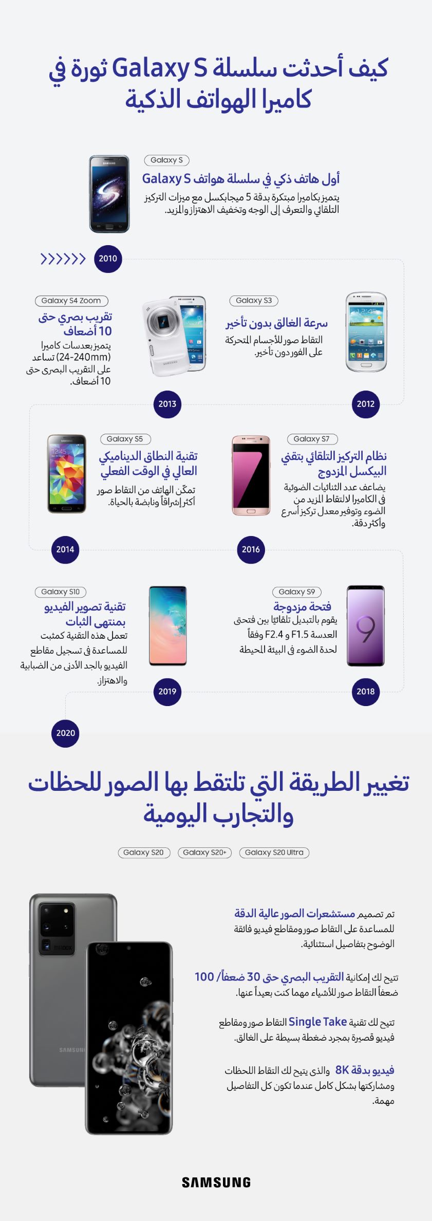 لقد تم تصميم كاميرا Galaxy S20 الرائدة بناءً على الإرث العريق الذي تميزت به ابتكارات سلسلة Galaxy S، والتي تميزت منذ ولادتها بدفعها حدود قدرات كاميرا الهواتف المتحركة وتمكين الجميع من الاستفادة من أحدث الابتكارات التكنولوجية.