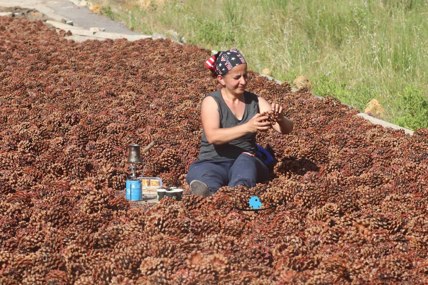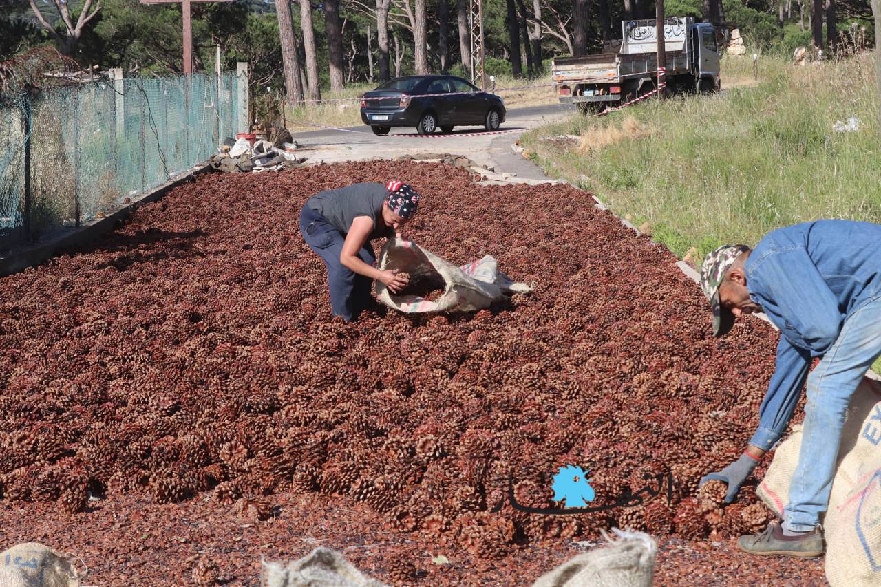 وموسم القطاف الذي بدأ منذ فترة ويستمر لغاية الشهر الحالي يجري على قدم وساق ويمر بمراحل عدة حتى يصبح جاهزاً لتصريفه وبيعه. وقالت ابنة بكاسين مارتا حرفوش المتعلقة بأرض أجدادها وآبائها، ولديها لهفة في جمع أكواز الصنوبر وتنقيتها منذ أكثر من 20 عاماً، إن المرحلة الأولى لبدء العمل في الموسم هي الأصعب والأخطر، تبدأ بإسقاط الأكواز عن أغصان الأشجار التي يصل ارتفاعها إلى أكثر من عشرة أمتار عبر تسلق شخص أو شخصين على الشجرة ونزع الأكواز بقضيب من القصب أو الحديد تسمى "معليقة" على الأرض، والمرحلة الثانية يتم فيها جمع الأكواز وفلشها على الطرقات أو على أسطح المنازل وتعريضها لأشعة الشمس حتى تجفّ، وفي المرحلة الأخيرة يصار إلى تعريب حبات الصنوبر عن الأكواز عبر آلات حديثة، وبعد تنظيف الحبّات تعمل آلة خاصة على تكسيرها واستخراج الصنوبر منها.