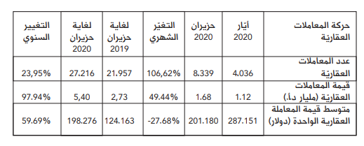 إستناداً الى تقرير المديرية العامة للشؤون العقارية، فقد انخفض متوسّط قيمة المعاملة العقاريّة الواحدة بنسبة 27.67 % على أساسٍ شهري إلى 201,180 دولار من 278,151 دولاراً في الشهر الذي سبقه. إرتفع متوسّط قيمة المعاملة العقاريّة الواحدة بنسبة 59.69 % على صعيدٍ سنوي إلى 198,276 دولاراً في الشهر السادس من العام الحالي، من 124,163 دولاراً في الفترة نفسها من العام السابق. وقد تقلّصت حصّة الأجانب من عمليّات المبيع العقاريّة إلى 1.57 % مع نهاية الشهر السادس من العام 2020، من 1.97 % في نهاية العام 2019.