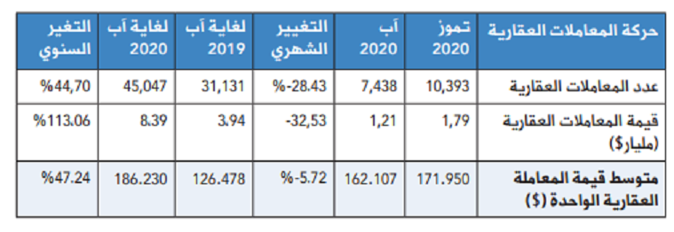 نتيجة لذلك، إنخفض متوسط قيمة المعاملة العقارية الواحدة بنسبة 5.72% على أساسٍ شهري إلى 162,107 دولاراً من 171,950 دولاراً في الشهر الذي سبقه. أما على صعيدٍ تراكمي، فقد ارتفع عدد المعاملات العقارية بنسبة 44.70% على صعيدٍ سنوي إلى 45,047 معاملة خلال الأشهر الثمانية الأولى من العام 2020، فيما تحسّنت قيمة معاملات المبيعات العقارية بأكثر من الضعف إلى 8.39 مليارات دولار، نتيجة لذلك إرتفع متوسط قيمة المعاملة العقارية الواحدة بنسبة 47.24% على صعيد سنوي إلى 186,230 دولاراً من 126,478 دولاراً في الفترة نفسها من العام السابق. وقد تقلّصت حصة الأجانب من عمليات المبيعات العقارية إلى 1.38% مع نهاية الشهر الثامن من العام 2020، من 1.97% في نهاية العام 2019.